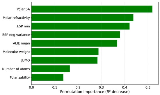Next, a feature importance analysis based on the permutation importance measure has been performed to gain insights into how individual molecular descriptors contribute to the predictive performance of the IonIL-IM-D1 model (Figure 3).
