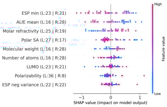 The permutation importance analysis highlighted molar refractivity and polar surface area (Polar SA) as the most influential features for predicting ionic liquid viscosity, suggesting that molecular volume and accessible surface area play a significant role in flow resistance and ion mobility. ESP min and ESP negative variance also ranked highly. They showed the importance of charge distribution and electrostatic interactions in controlling viscosity. Furthermore, ALIE mean, which reflects local ionization energies, and molecular weight contributed meaningfully, indicating the importance of molecular size and stability. Features describing frontier orbital energy (LUMO), atomic count (number of atoms), and polarizability showed additional relevance, supporting the notion that viscosity arises from a complex interplay of geometric, electronic, and dynamic molecular properties. These insights could inform future feature engineering by emphasizing descriptors linked to molecular packing, intermolecular forces, and ion–ion interactions, thereby further improving the IonIL-IM-V model. Further, the SHAP analysis for the IonIL-IM-V model has been performed (Figure 10).