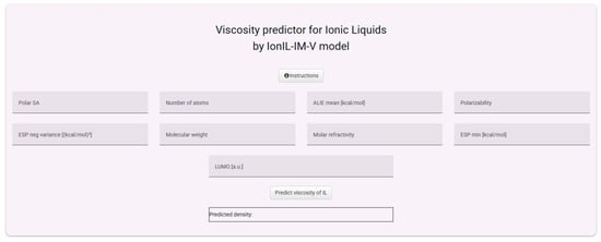 The IonIL-IM-D1, IonIL-IM-D2, and IonIL-IM-V models are freely available as interactive web applications hosted on the Atomistica Online 2025 application (https://atomistica.online). These applications are designed to make predictive modeling of ILs highly accessible to both experts and non-experts in materials science. By inputting a set of pre-calculated molecular descriptors, users can instantly obtain predicted values for either the density or viscosity of their ionic liquid candidates.