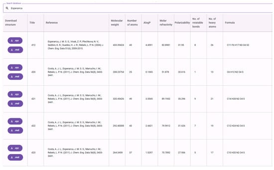 In addition to the predictive models, each corresponding application includes, at the bottom of the page, curated and searchable databases of the ILs used to train the density and viscosity models (Figure 13).
