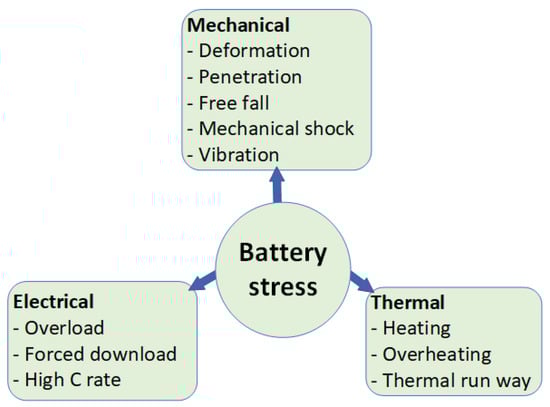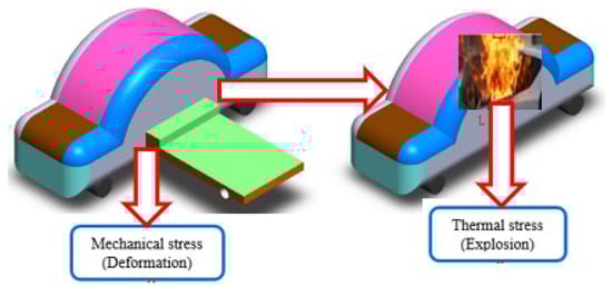 In numerous studies, detailed analyses have been conducted on responses to safety incidents involving energy sources subjected to overloading. From these analyses, external stresses impacting the energy sources have been categorized, as referenced in [15,16,17] and depicted in Figure 2.