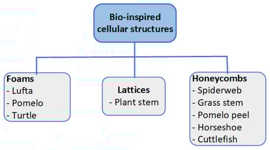 The biomimetic approach, first used in an energy absorption application in 2000, has been widely applied in various systems, including front components of cars and trains [25,26], aircraft wings, and defensive armor [27]. Naturally occurring cellular structures are commonly found in human bone, honeycomb structures, fungi mushrooms, Voronoi structures in bubbles, dragonfly wings, leaf structures, toucan beaks, turtle shells, bird bones, and antlers [28].