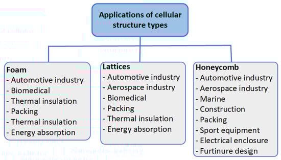 Bio-inspired cellular structures are characterized by their efficient use of materials and unique geometries that enhance mechanical performance. The design of cellular structures is bio-inspired, which means that these designs often draw from natural forms such as animals like human bone [57,58], turtle shells, antlers, toucan beaks [28] and various plants like grass stems, pomelo peel [59], bamboo, leaves [60], as well as fungi like mushrooms and insects like honeycomb bees, dragonflies, beetle elytron, and spider webs [28,61]. Applications of each cellular structure based on the data collected from open publications are summarized in Figure 5.