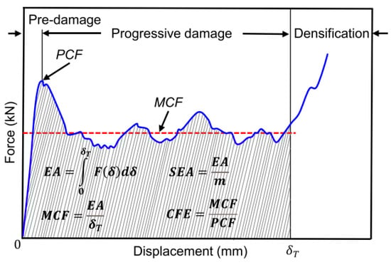 Energy absorption is crucial in structures designed to absorb impact energy. It involves converting kinetic energy into strain energy through mechanisms like plasticity, friction, and viscoelasticity. Material characteristics, loading circumstances, deformation modes, and structural arrangement are some of the variables that affect energy absorption [108]. Energy absorption (EA), specific energy absorption (SEA), peak crash force (PCF), mean crash force (MCF), and crash force efficiency (CFE) are important metrics to evaluate structures for their energy-absorbing characteristics. These indicators, derived from the load-displacement curve, provide insights into how effectively structures dissipate impact energy, and they are analytically formulated as shown in Figure 6, which depicts a typical force-displacement curve for materials that absorb energy during dynamic compression.