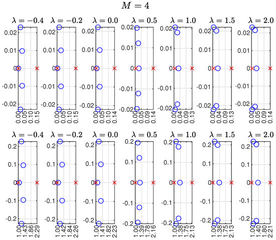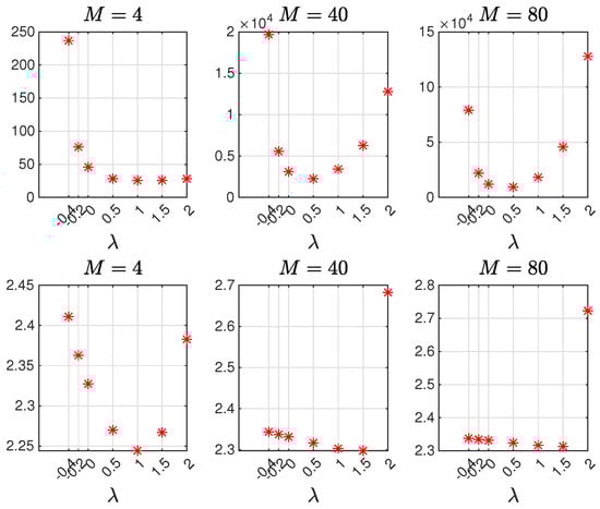 Now, we shift gears and turn our attention to how we can effectively solve system (25) numerically. Notice, first, that while complex exponentials are excellent as basis functions for representing periodic functions, they are often less suitable for nonperiodic functions. On the other hand, orthogonal polynomials are specifically designed to approximate nonperiodic functions over finite intervals, making them a more natural choice for nonperiodic integral equations. Since the coefficient vector function is generally nonperiodic, we solve system (25) using a variant of the SG integral PS method of Elgindy [27] and Elgindy [25]. The latter methods use the barycentric SGG quadratures, constructed using the stable barycentric representation of shifted Lagrangian interpolating polynomials and the explicit barycentric weights for the SGG points, well known for their stability, efficiency, and superior accuracy. These barycentric SGG quadratures allow us to construct the SGIMs (also known as the SG operational matrices of integration) that can effectively evaluate the sought definite integration approximations using matrix–vector multiplications, often leading into well-conditioned systems of algebraic equations. In the present work, we generate the necessary barycentric SGIMs using [28] (Equation (4.38)), which directly defines the required barycentric SGIMs in terms of the barycentric Gegenbauer integration matrices. This modification to the methods of Elgindy [25,27] skips the need to shift the quadrature nodes and weights and Lagrangian polynomials from their original time domain () to the shifted time domain (), and directly constructs the desired SGIM by premultiplying the usual Gegenbauer integration matrix by a scalar multiple, unless the approximate solution values are required at non-collocation time nodes. That is, if we denote the first-order barycentric SGIM by then [28] (Equation (4.38)) immediately tells us that
