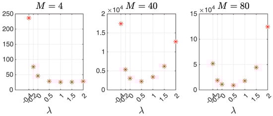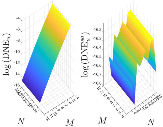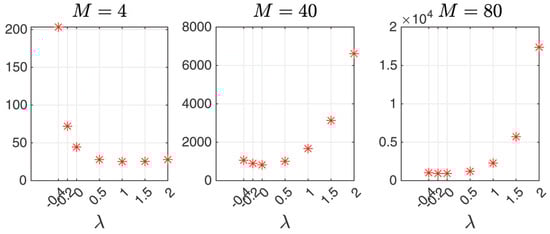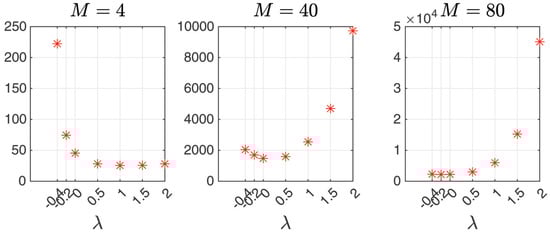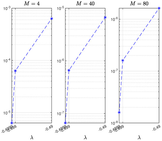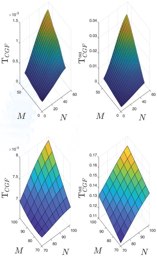 where is the serial time to solve the systems, and is the additional time incurred due to the parallel computing process itself from tasks such as communication, synchronization, and workload distribution. These are generally negligible if the workload per system, , is sufficiently large compared to the overhead. If the overheads are minimal, the computational time is reduced significantly to approximately by Equation (45). It is important to understand here that parallel computing is not useful for small datasets, as the associated overhead can outweigh the potential gains from parallelization. In such cases, a standard sequential “for” loop might be more efficient. It is noteworthy to mention also, here, that the constant nature of the matrix allows us to precompute and store it prior to executing the code for solving these systems, reducing the runtime overhead. Moreover, the numerical quadrature induced by (or ) through matrix–vector multiplication converges exponentially, enabling nearly exact approximations with relatively few quadrature nodes [28]. Consequently, systems (44) can be solved efficiently and with high accuracy using a relatively low M values, significantly improving the computational efficiency without compromising precision.