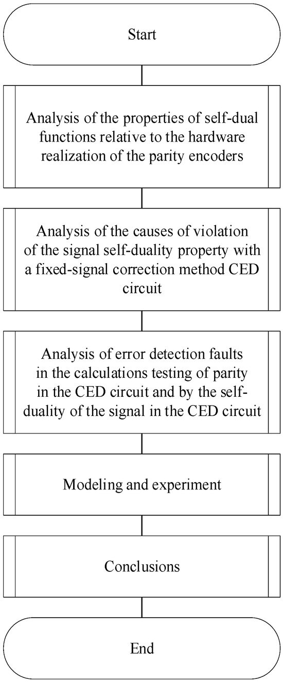 Figure 1 shows a flow chart of the algorithm demonstrating the research plan. The task is divided into five main blocks. The first process implements the task of analyzing the properties of self-dual functions through an analysis of the schematic implementation of the parity coders. Here, the features of linear Boolean functions are analyzed; they are simultaneously self-dual. The second process is aimed at analyzing the causes of the violation of the self-duality property of the signal though analysis using the signal correction method fixed in the CED circuit. Here, it is important to find a pattern in the conditions under which the faults of the encoder elements are masked. The third process is related to the analysis of error detection features during calculations testing. The calculations testing are monitored using parity code and the self-duality of the signal in the CED circuit. It is established how the faults of the parity code encoder are covered. The fourth process demonstrates experimental research using the example of the simplest diagnostic object. It also confirms the theoretical positions formulated by the authors. The fifth process contains conclusions and recommendations on the practical application of the results obtained by the authors.
