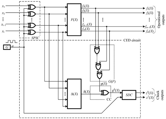 The structure of the CED circuit organization with the calculations testing based on two diagnostic signs based on the parity code. In Figure: F(X)—diagnosis object, G—generator, G(F)—parity code encoder, G(X)—parity function calculation circuit, Δ(X)—correction function calculation circuit, CC—correction circuit, SDC—self-dual checker, SPSC—signal to pulse sequence converter, TRC—two-rail checker.