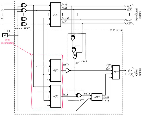 The structure shown in Figure 2 has the following key feature: the difference from the traditional CED circuit with calculations testing of parity [21] is the use of Boolean correction signal (BCS) from the parity signal-compressing circuit. It is possible to build a huge number of blocks for calculating the function δ(X) of signal correction. Among them, one can choose the implementation of the Δ(X) block, which will have the lowest value of complexity for the technical implementation. The number of ways to transform a single parity function g(X) into a self-dual function gδ(X) on 2t sets of argument values is equal to . For this number, the simplest option can be selected.