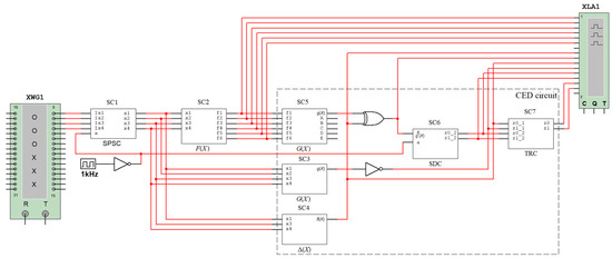 Based on the obtained description, we synthesize a structure with calculations testing based on two diagnostic signs. We implement the system model (Figure 5) using Multisim 14.0. In it, the SC1 block is an SPSC block. Block SC2 is the diagnostic object F(X). Block SC3 is the device G(X). Block SC4 is the device Δ(X). Block SC5 is the coder G(F), which is the object of the study. The SC6 and SC7 devices are a self-dual checker and a two-rail signal compression module. The structure of the dual signal tester is shown separately in Figure 6, as it is rarely found in publicly available sources.