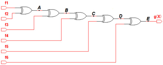 The structure of the encoder G(F) is disclosed in Figure 7, where the points A–E are displayed. The authors of the article introduced single stuck-at faults.