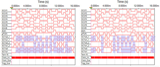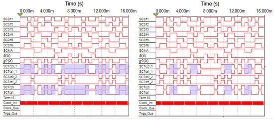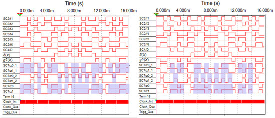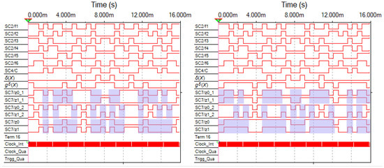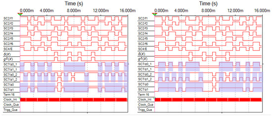The structure of the coder G(F) is disclosed in Figure 7, where the points A–E are displayed. The authors of the article introduced single stuck-at faults. Each figure shows a diagram on the left with the stuck-at-0 fault, and on the right with the stuck-at-1 fault. The time diagrams from the testers’ outputs are highlighted. The color shows the clock cycles in which the sets of values of the test arguments are supplied. Outputs z0_1 and z1_1 correspond to the outputs and of the CED circuit shown in Figure 5. At this checkpoint, the parity calculations are checked. Outputs z0_2 and z1_2 correspond to the outputs of the CED circuit shown in Figure 5. At this check point, the self-duality of the signal gδ(X) is checked. Outputs z0 and z1 are the check outputs of the CED circuit by two diagnostic signs.