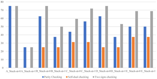 It is clear that in the best cases it is possible to ensure that the structures of blocks G(X) and Δ(X) do not exceed the complexity of block G(X). This involves the total complexity of the implementation. However, even with a certain excess of this value, the function gδ(X) can also be made quite simple. This follows from the possibilities of obtaining different self-dual functions from t arguments. Therefore, an optimization problem can be solved by choosing the best conversion method that provides the minimum amount of redundancy. The option of fully implementing the parity function could be interesting. It may also be interesting to use a correction function using a single logical expression or with the partial matching of expressions. This will allow you to implement a check circuit with minimal redundancy. The simplest structure will be one in which only one parity function is implemented. Therefore, in practice, the structure proposed by the authors will often be somewhat more complex than the classical parity check structure. However, a slight complication of the CED circuit makes it possible to increase the testability indicators. The diagrams in Figure 13 show that the effect can be up to 20% compared to the testability indicators for only one of the methods. Such indicators are not achieved using classical approaches related to duplication and parity.