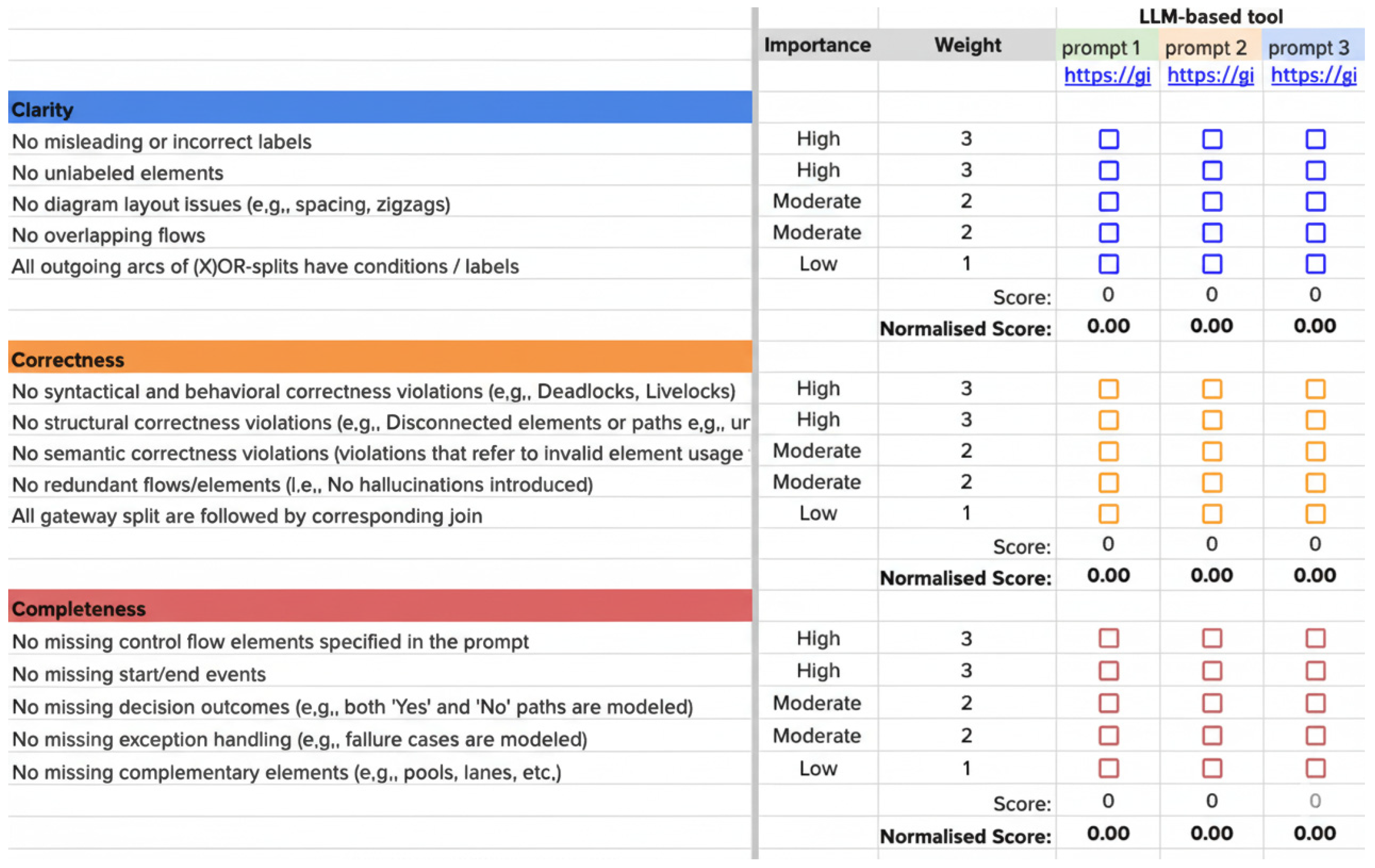 As a result of this selection strategy, the final evaluation dataset consisted of 15 BPMN models (i.e., 3 per tool, each representing the best output for each prompt). These models were subsequently evaluated using a structured scoring sheet based on the predefined 3C quality framework (Clarity, Correctness, and Completeness).