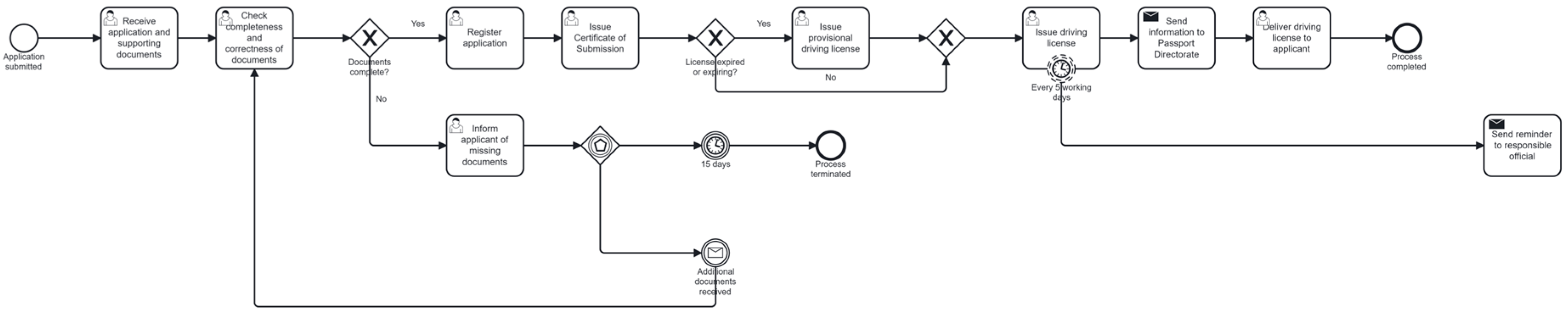 33]. This process is one of the most frequently used public services in Greece, reflecting high citizen engagement. It is well-documented, digitally accessible, and a government priority due to its impact on public safety and mobility. During testing, this real-world reference process allowed consistent comparison of outputs generated by each tool.