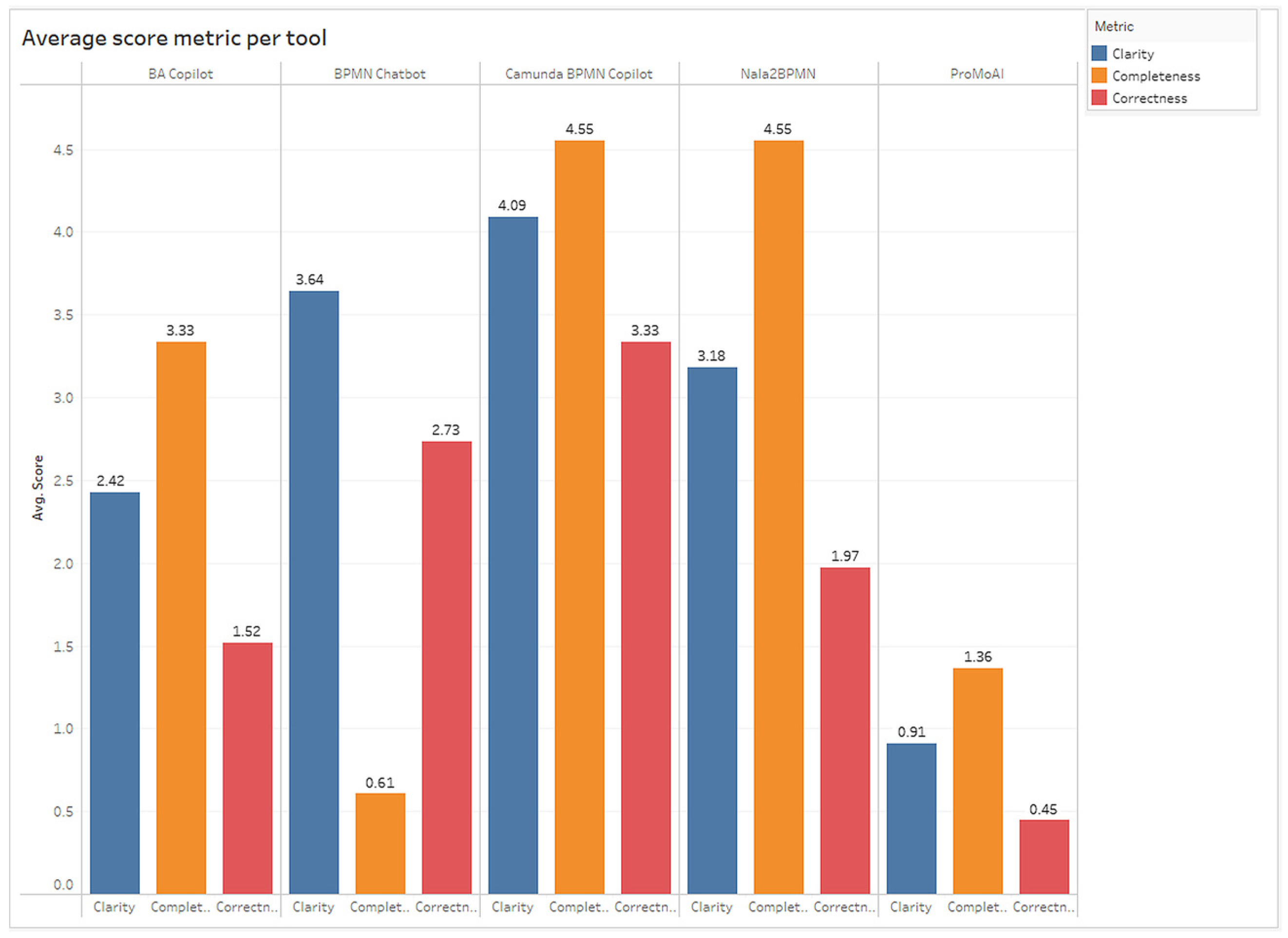 The results reveal substantial variation in tool performance. Camunda BPMN Copilot achieved the highest scores across all three dimensions, with particularly strong performance in Clarity (4.09) and Completeness (4.55). In contrast, ProMoAI exhibited the lowest performance overall, especially in Clarity (0.91) and Completeness (0.45), indicating limited effectiveness in producing comprehensible or complete BPMN diagrams. Furthermore, variations might exist within a single tool across different dimensions. For instance, Nala2BPMN achieved a high score in Completeness (4.55) but performed below average in Correctness (1.97), highlighting that a tool might excel in one dimension while struggling in another one.