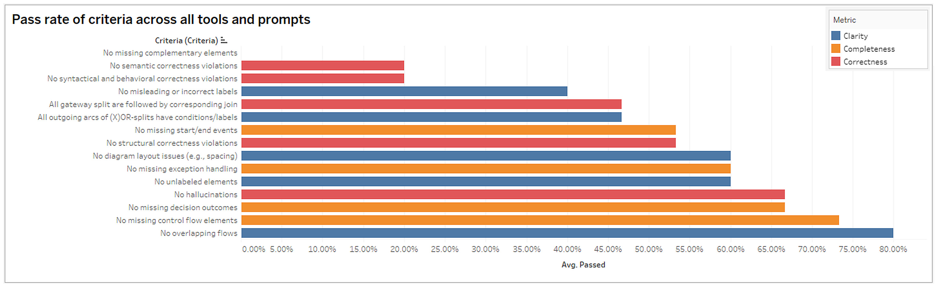 The results reveal substantial variation in pass rates across the 15 criteria, highlighting both strengths and persistent challenges in state-of-the-art LLM-based process modeling tools. The highest pass rates were observed for the Clarity and Completeness criteria “No overlapping flows” (80%) and “No missing control flow elements” (73.33%), respectively. These results indicate that most tools are generally capable of identifying the required process components and presenting them in a visually clean and readable format.