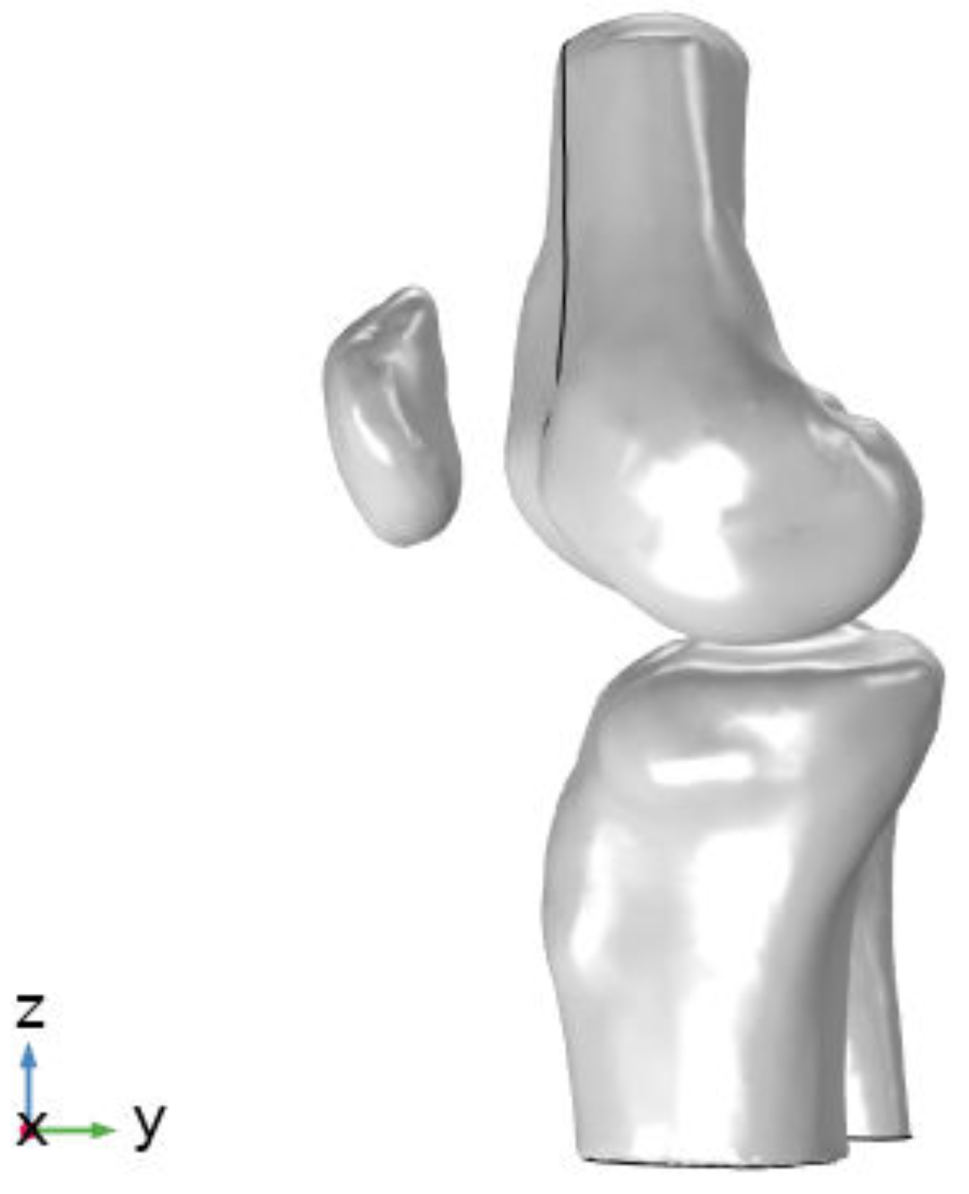 To perform the Finite Element Analysis (FEA), the distal femur was discretized into a high-density mesh. As the knee flexion angle changes, the contact area and orientation of the mesh are updated to reflect the physical geometry of the standing,