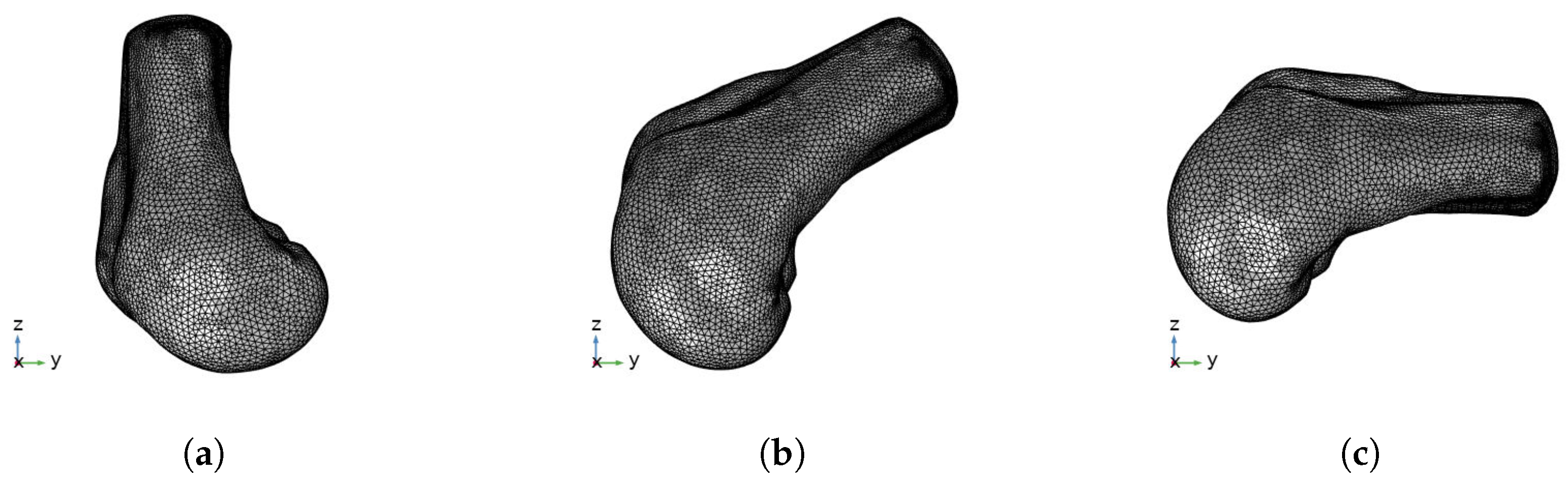 Implementation of Body Forces: In this study, body forces are defined exclusively as gravitational acceleration () applied volumetrically across the entire femoral domain. No additional approximations for muscle forces (e.g., quadriceps or hamstrings) or ligamentous constraints (e.g., ACL/MCL tension) were included in the body force vector.