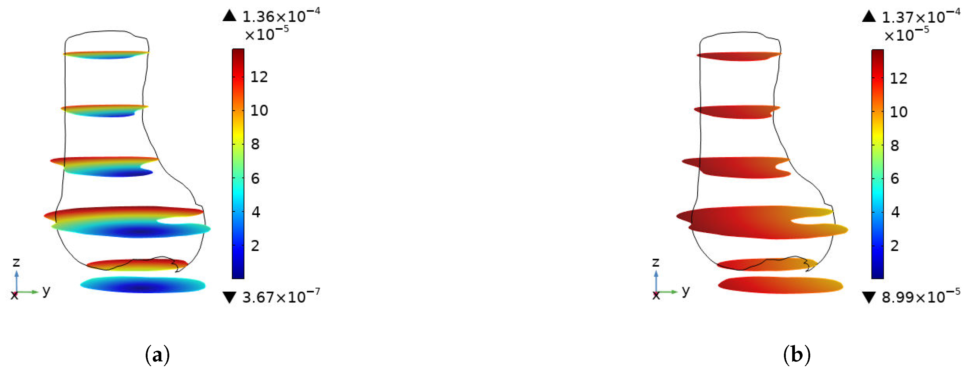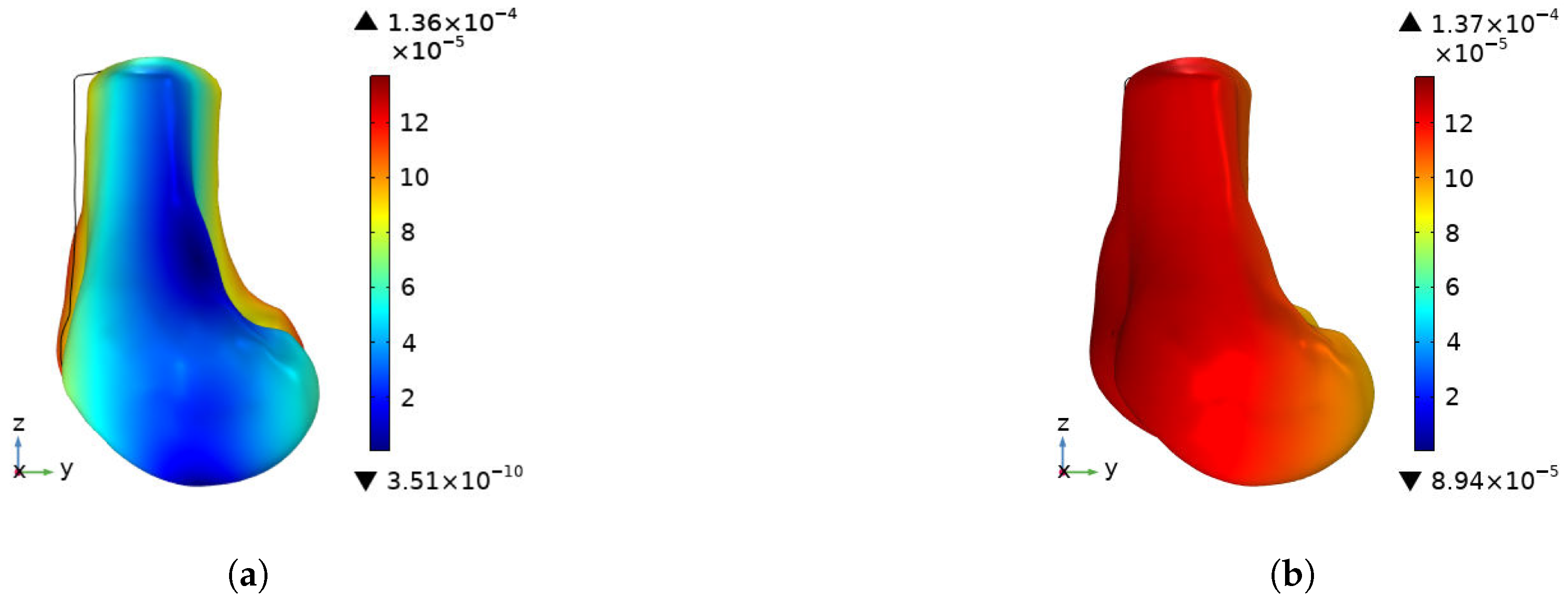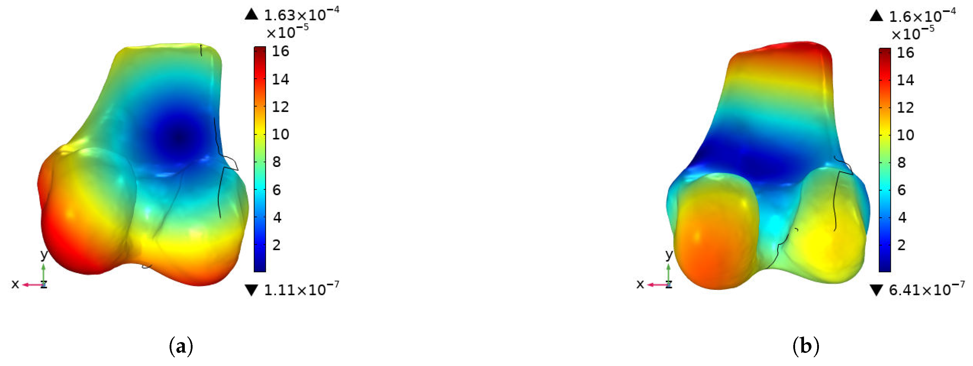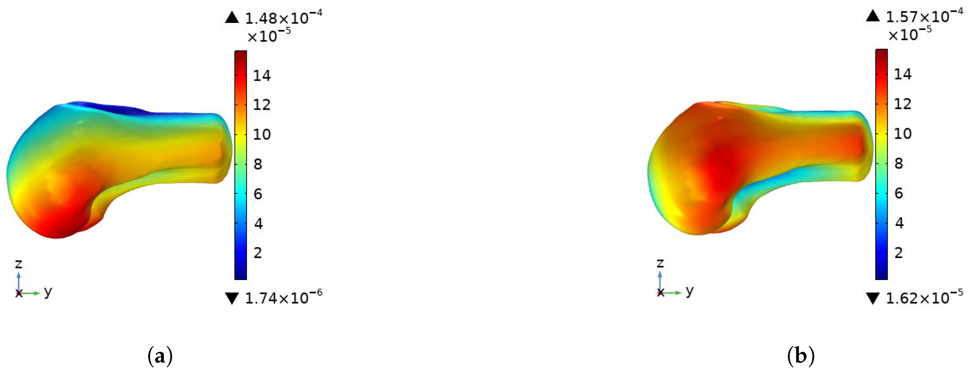 Total Displacement: Measured in millimeters (mm), representing the global structural deformation and stiffness of the bone.
