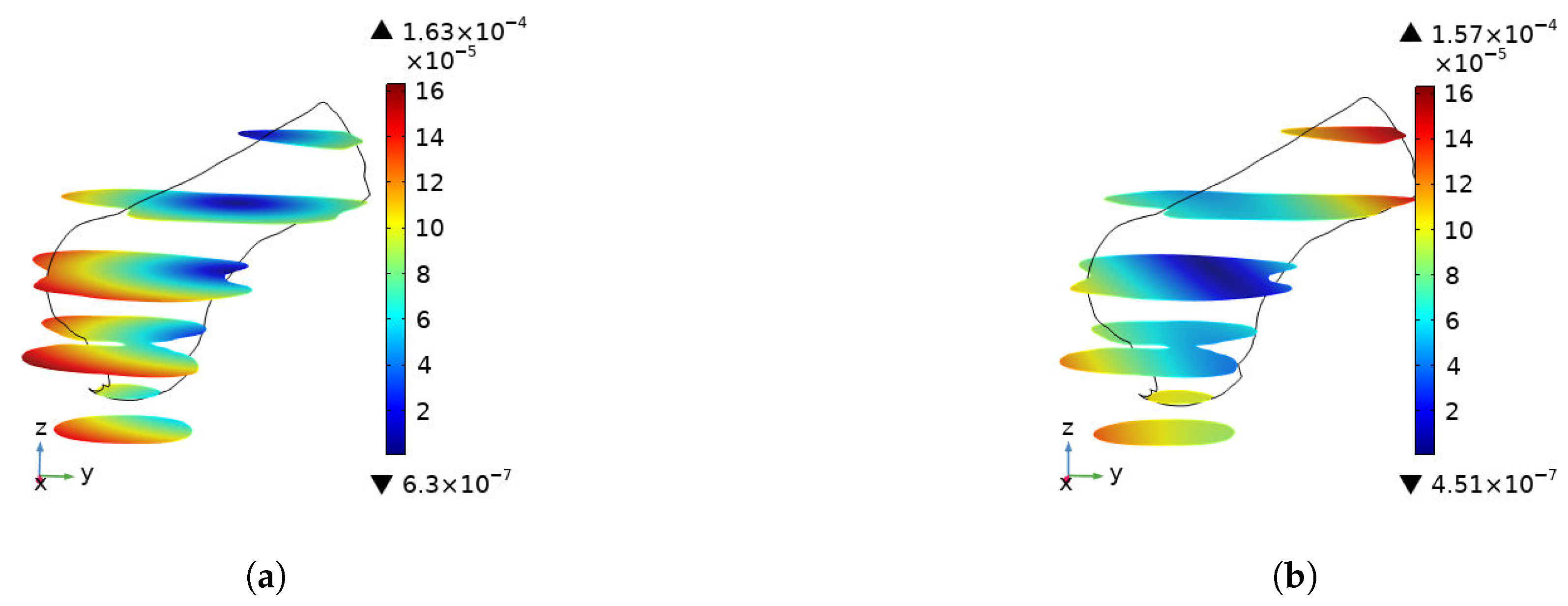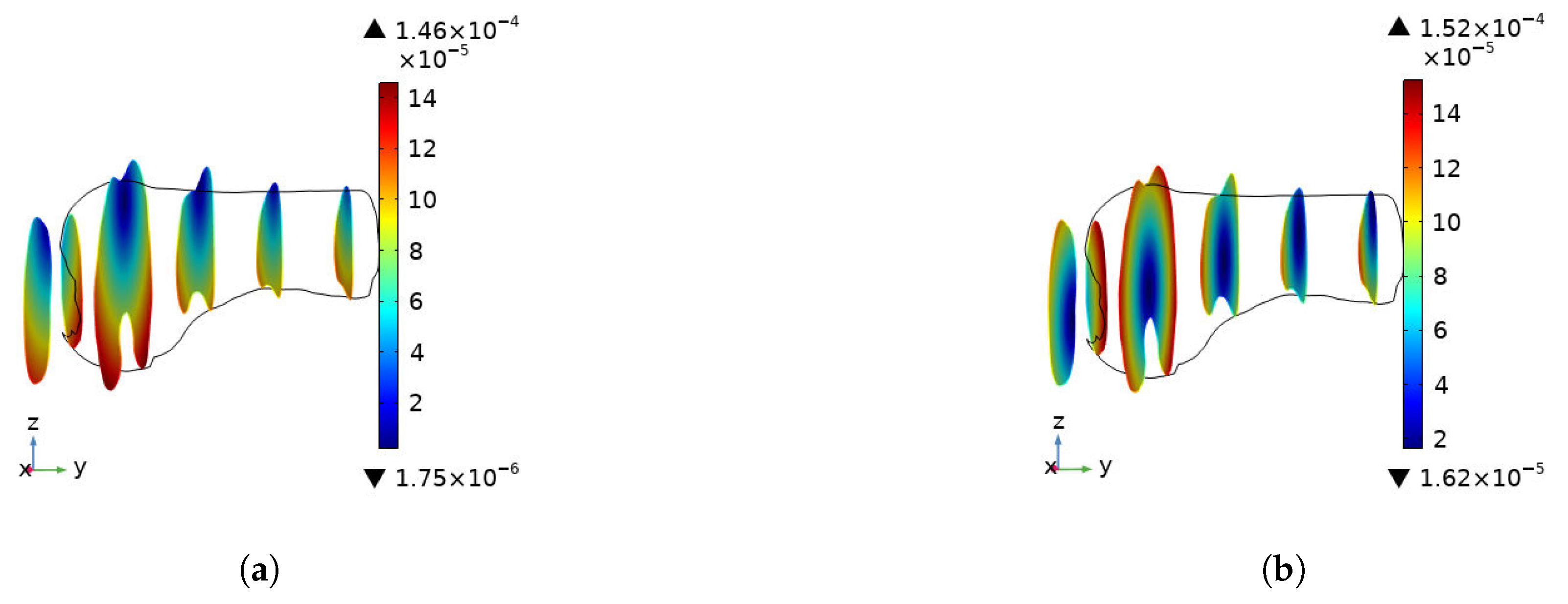 Table 3 reports the absolute global maxima for the 3D volume, the cross-sectional plots illustrate localized internal gradients. Consequently, the peak values observed on these 2D planes may appear lower than global peaks as they capture data only within the specific cutting plane.