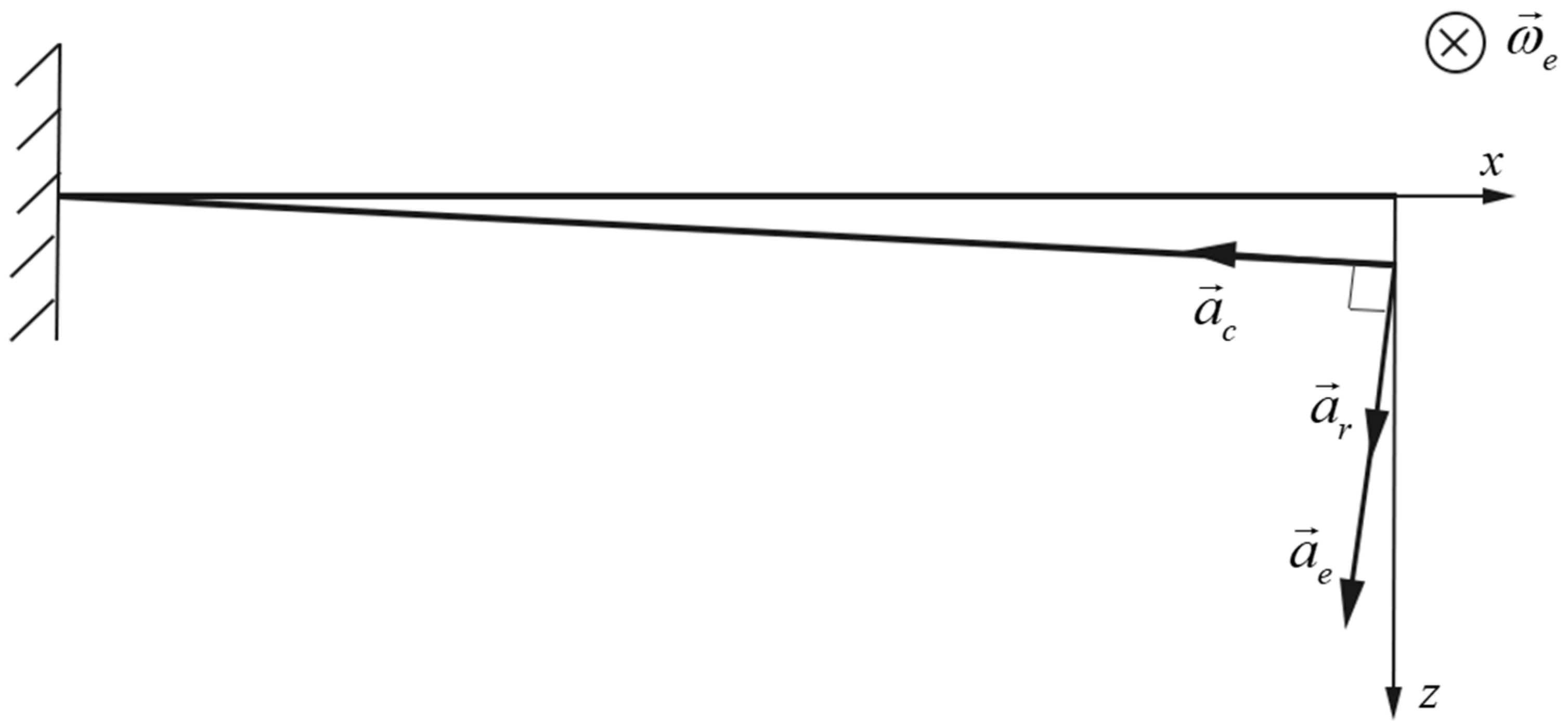 In the original system, the problem of the thermal shock’s influence on the parameters of the solar panel’s natural oscillations is solved within a system of bodies: the fixed housing of the spacecraft and the solar panel, which is subject to natural oscillations and thermal shock. The assumptions made allow for the consideration of a reduced system. In this system, the influence of thermal shock is replaced by the rotation of the spacecraft. This rotation is caused by the moment (5). However, in this formulation, the oscillations occur in a moving coordinate system, leading to the emergence of Coriolis acceleration.