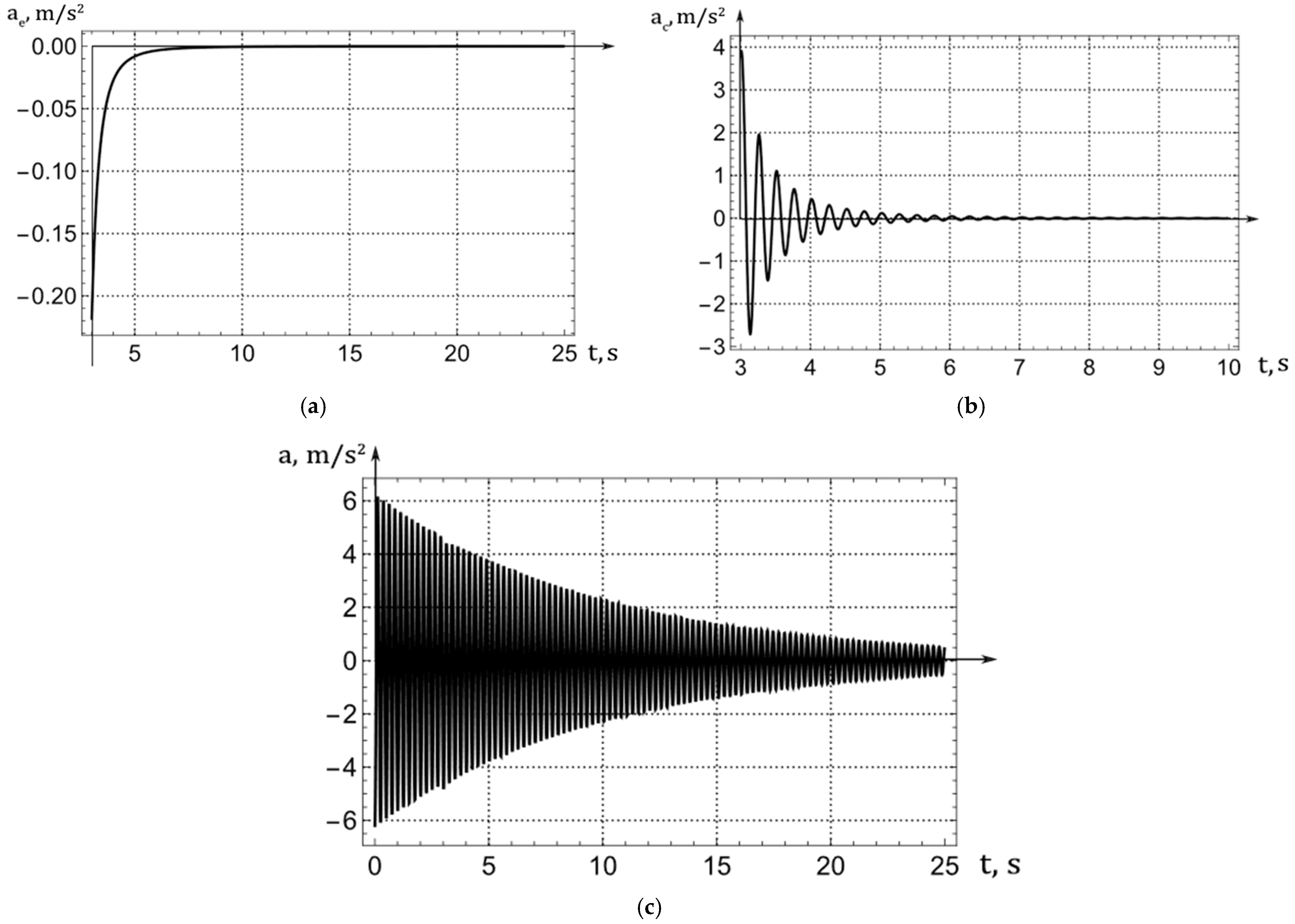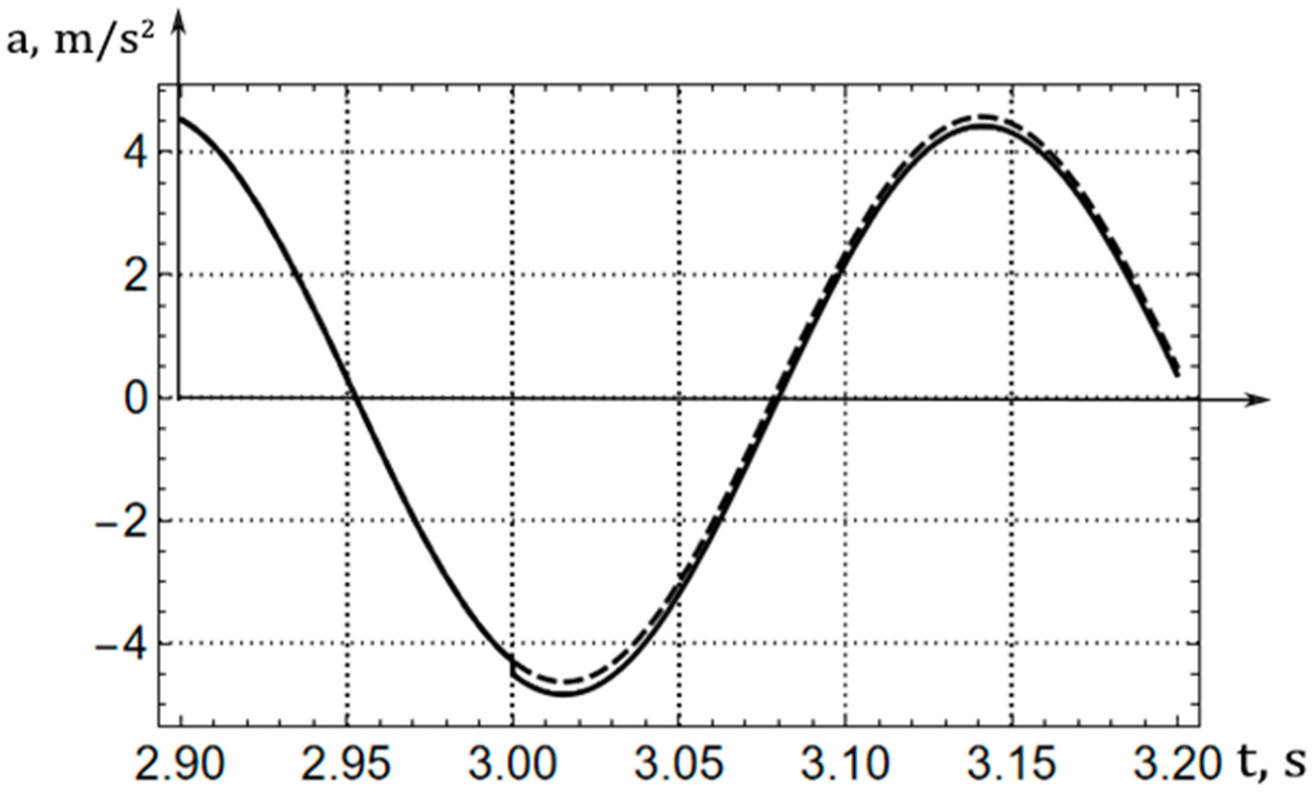 Let us conduct a comparative analysis of the model’s total acceleration with and without considering the Coriolis acceleration. For this purpose, they are plotted on the same graph near t = 3 s (the time of the thermal shock occurrence according to Assumption 3).