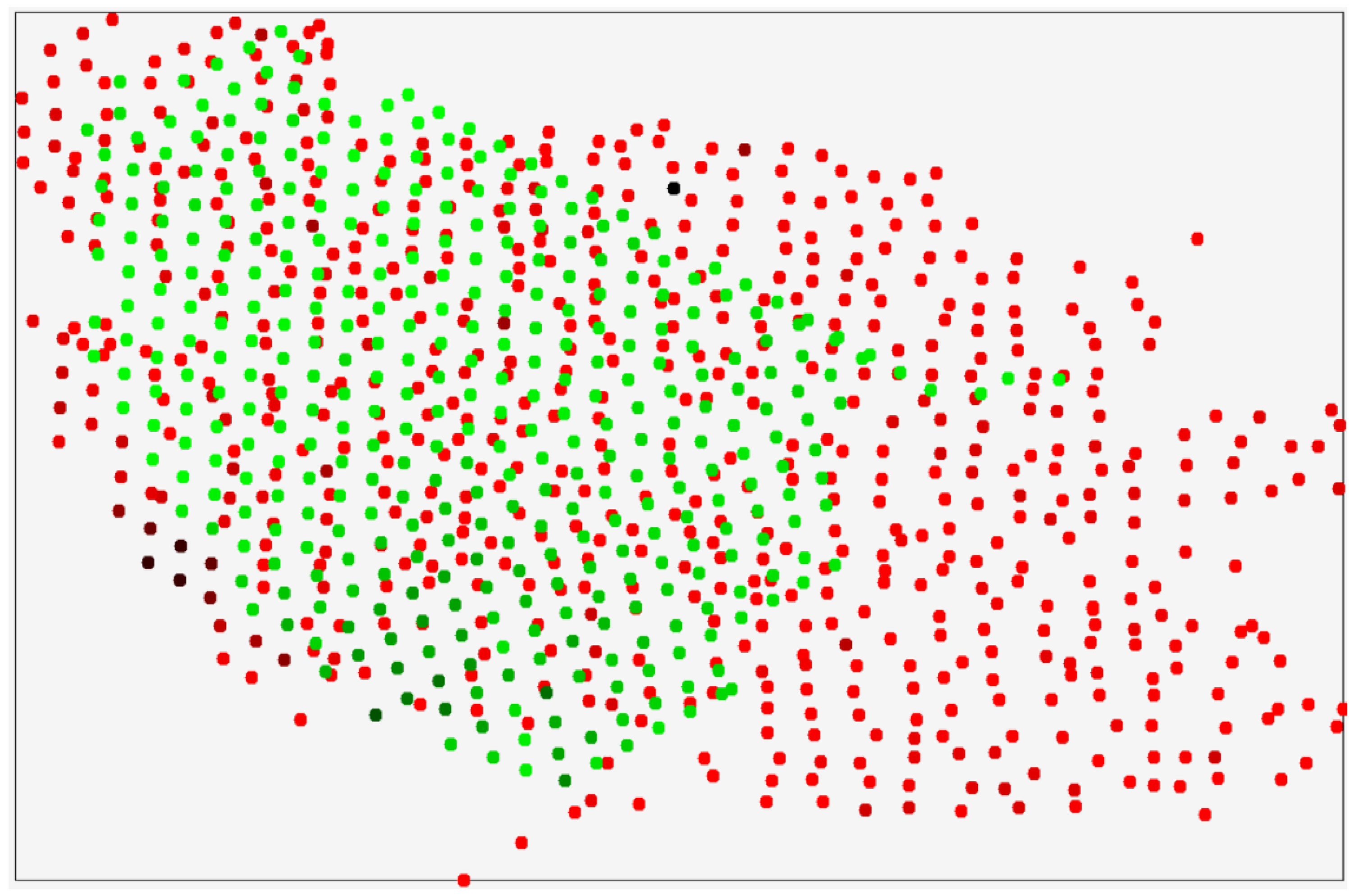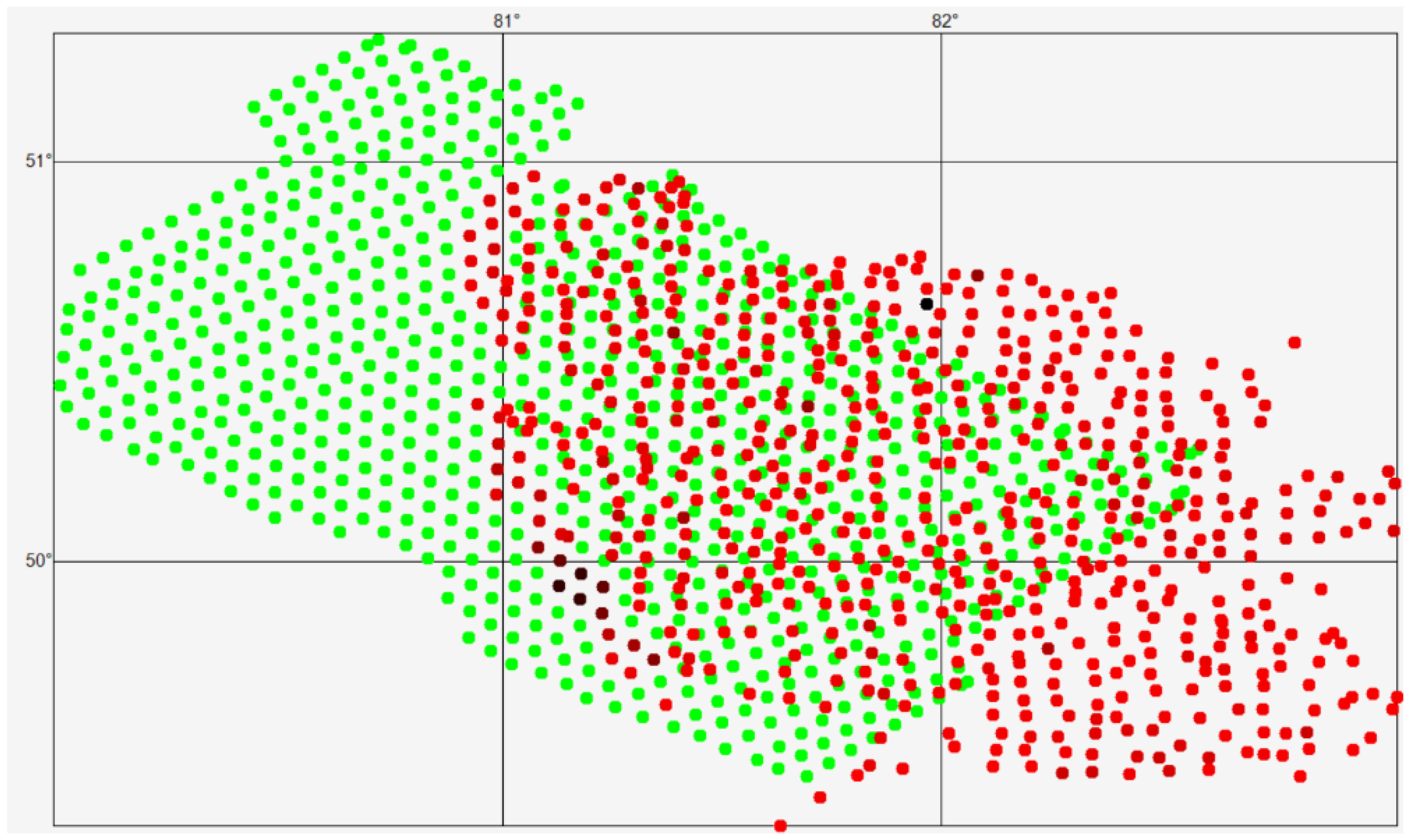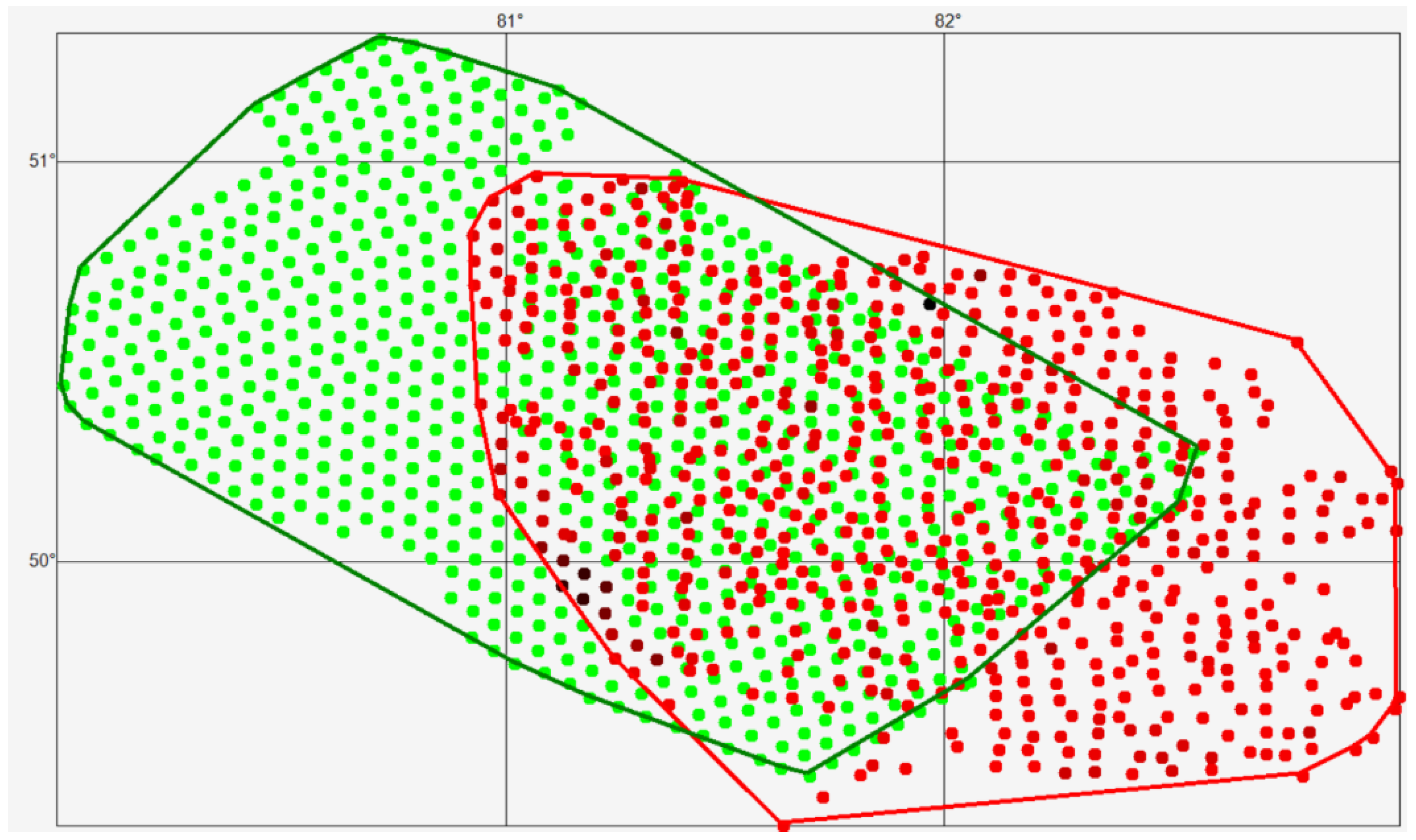 We introduce the following notation: R is the set of points with geochemical sampling results (red), and G is the set of generated points (green), then: C is the union of these sets: C = R∪G, S—the intersection of these sets: S = R∩G, RG—the difference in the sets: RG = R\G, GR—the difference in the sets: GR = G\R. Then, based on the adopted notation: GR—the set of generated points located in the area covered by a thick layer of unconsolidated deposits; SR—the set of generated points belonging to the intersection of the sets S = R∩G; SG—the set of points with known geochemical analysis results belonging to the intersection of the sets S = R∩G.