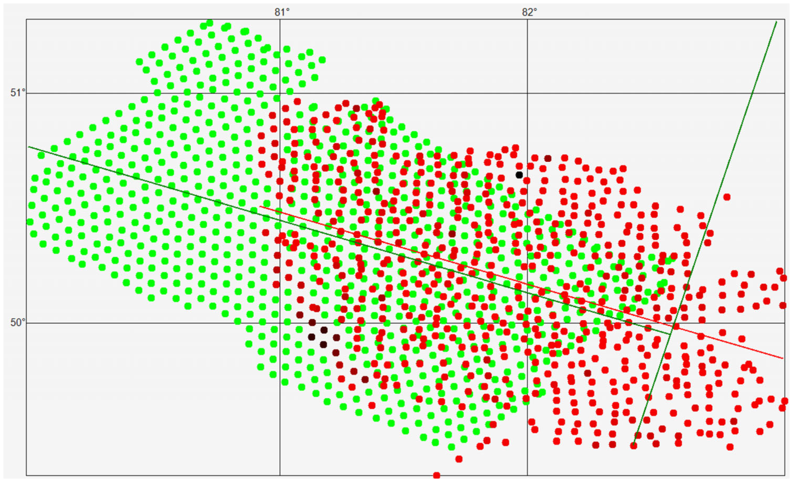 Figure 3, southeast of the prediction line (the green line perpendicular to the correlation line of the generated set) are the red points for which geochemical sampling results are known, while northwest of the prediction line are the green points for which the mineral content must be forecasted. Note that points with known geochemical sampling results may also lie in the left half-plane. Thus, for forecasting, it is necessary to select such a point from the prediction set R that, when the prediction line is drawn through it, there is a certain number of geochemical sampling points located to the right of this line.