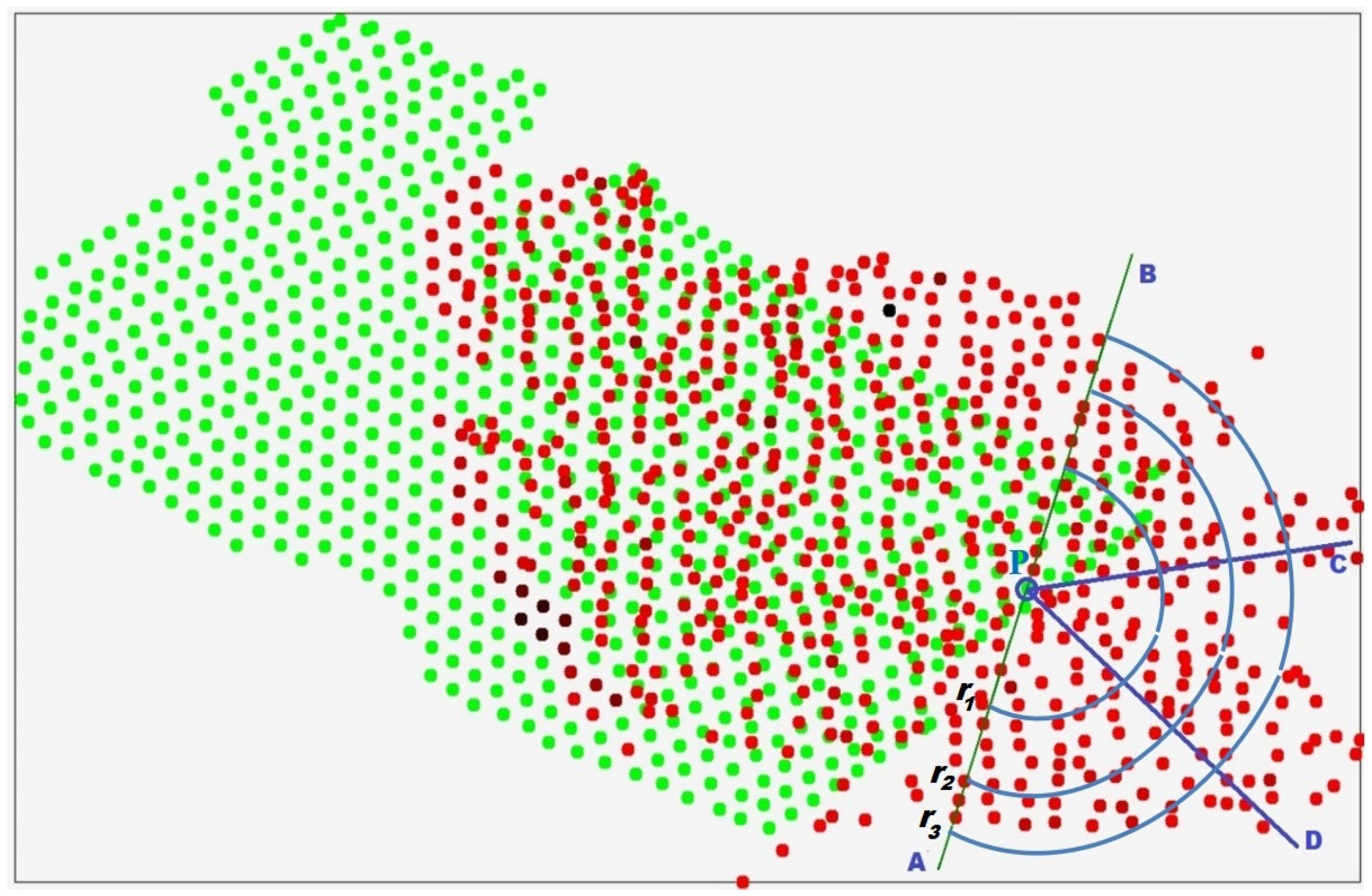 Figure 4 illustrates the geometric construction used to define the proposed information measure. In this example, the right half-plane is partitioned into three angular sectors, each of which is further subdivided into three radial subsectors, forming a structured directional representation of the spatial neighborhood. The number of sectors and subsectors can be selected depending on the mineral type, the spatial distribution of sampling points, and other relevant factors. After completing the required geometric constructions, we proceed to analyze the points with known geochemical assay results that fall within each subsector. Let us denote by