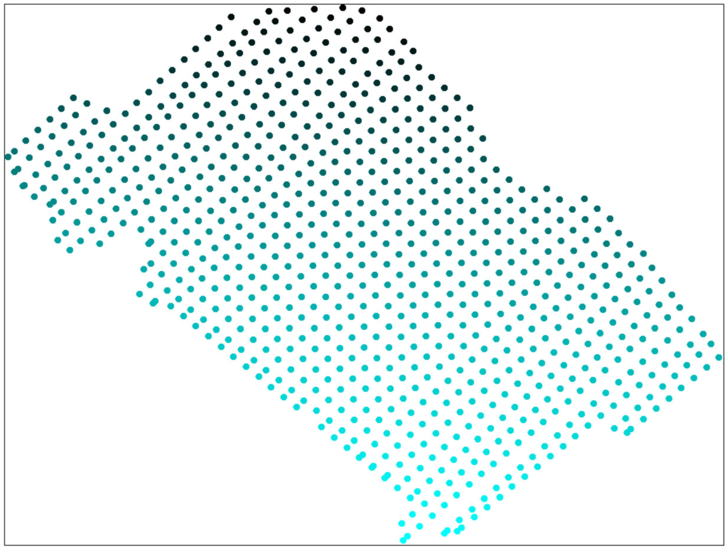 Figure 1, which shows the locations of the geochemical sampling points. The color intensity of the points reflects the corresponding concentration values, with darker shades indicating higher mineral content. Points displayed with uniform color denote locations for which geochemical assay results are unavailable.