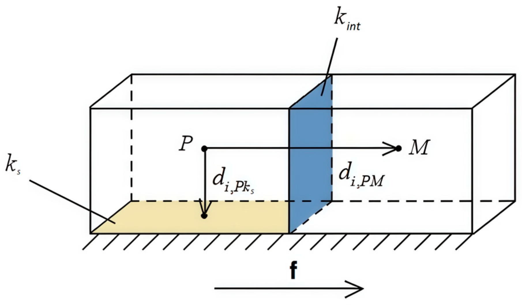• Here, k is the set of faces of cell P consisting of the set of internal faces k i n t and the set of external faces k s . The neighboring cell across the internal face k i n t is denoted as M. S i , k is the area vector of face k, where i is the component index of the vector. The vector drawn from the center of cell P to the center of cell M across the face k i n t is denoted as d i , P M = r i , M r i , P , and the vector drawn from the center of P to the center of face k s as d i , P k s = r k s r P , where r i is the radius vector. The flow through the face is denoted by f and its direction is indicated by an arrow.