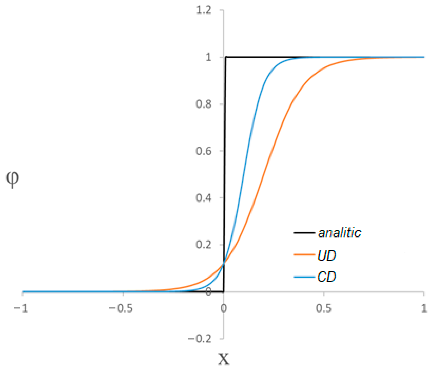 The CD scheme is the least dissipative, but it is absolutely unstable (this is especially true for finite-volume discretization of Navier–Stokes equations on arbitrary unstructured meshes consisting of randomly shaped polyhedra, where designing a scheme with an accuracy above second order is essentially impossible) [22,28,47], as its use in the presence of large gradients leads to oscillations in the solution field. Figure 2 shows an example of how three numerical schemes differ in their numerical diffusion.