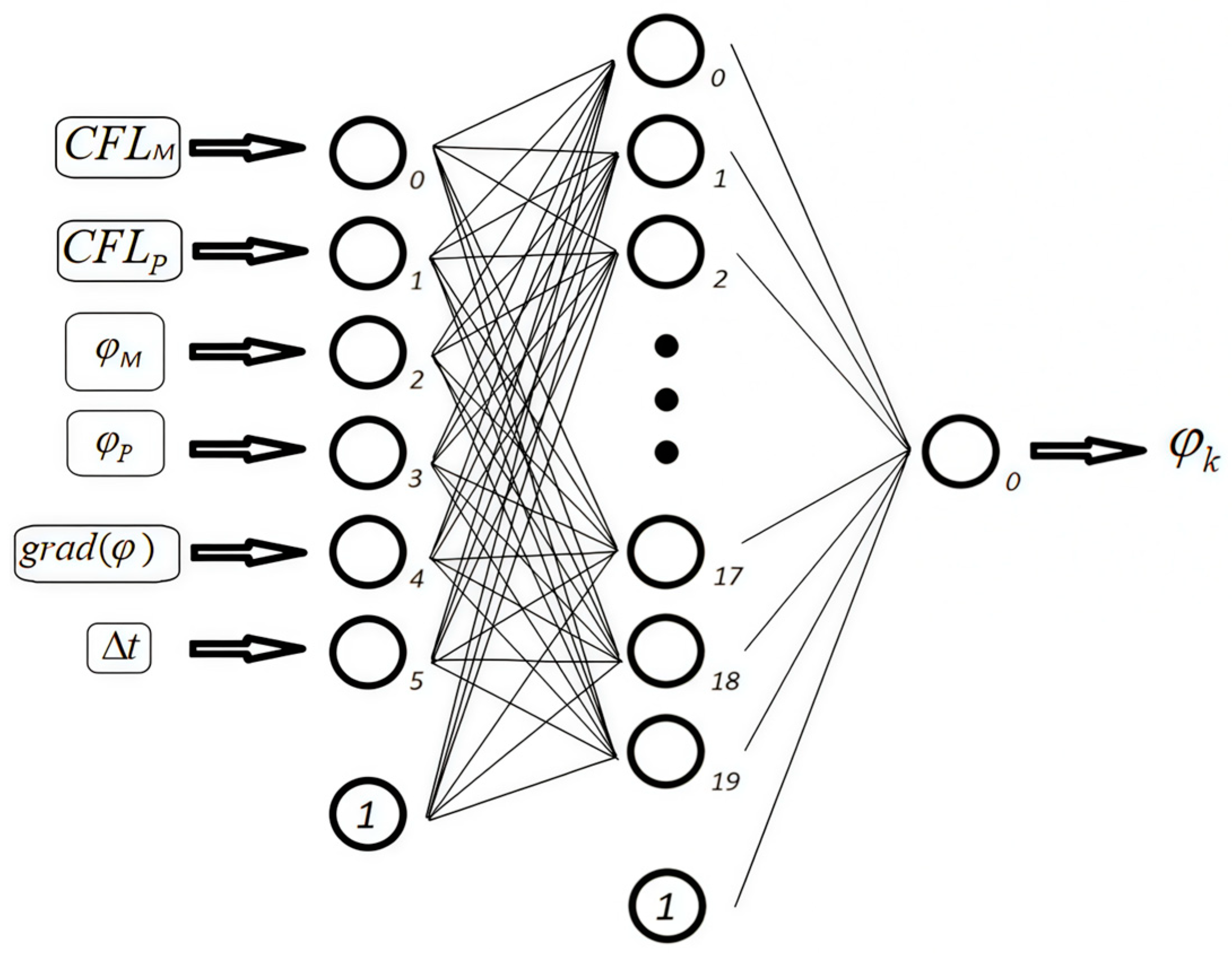 In addition to the parameters mentioned above, the accuracy of convective term discretization depends on the Courant number. Therefore, Equations (4) and (5) can be refined by introducing additional parameters, namely the time step Δt and the Courant number CFL in cells P and M, respectively. Although Δt and CFL are mathematically related through the local flow velocity and cell size, in the present study both parameters were provided separately as inputs to the neural network. This choice was made as an initial experimental simplification to allow the network to independently learn the sensitivity of the convective term to both the absolute time step and the non-dimensional Courant number. In other words, this setup enables the network to capture potential nonlinear interactions between the step size and CFL that may affect stability and accuracy.