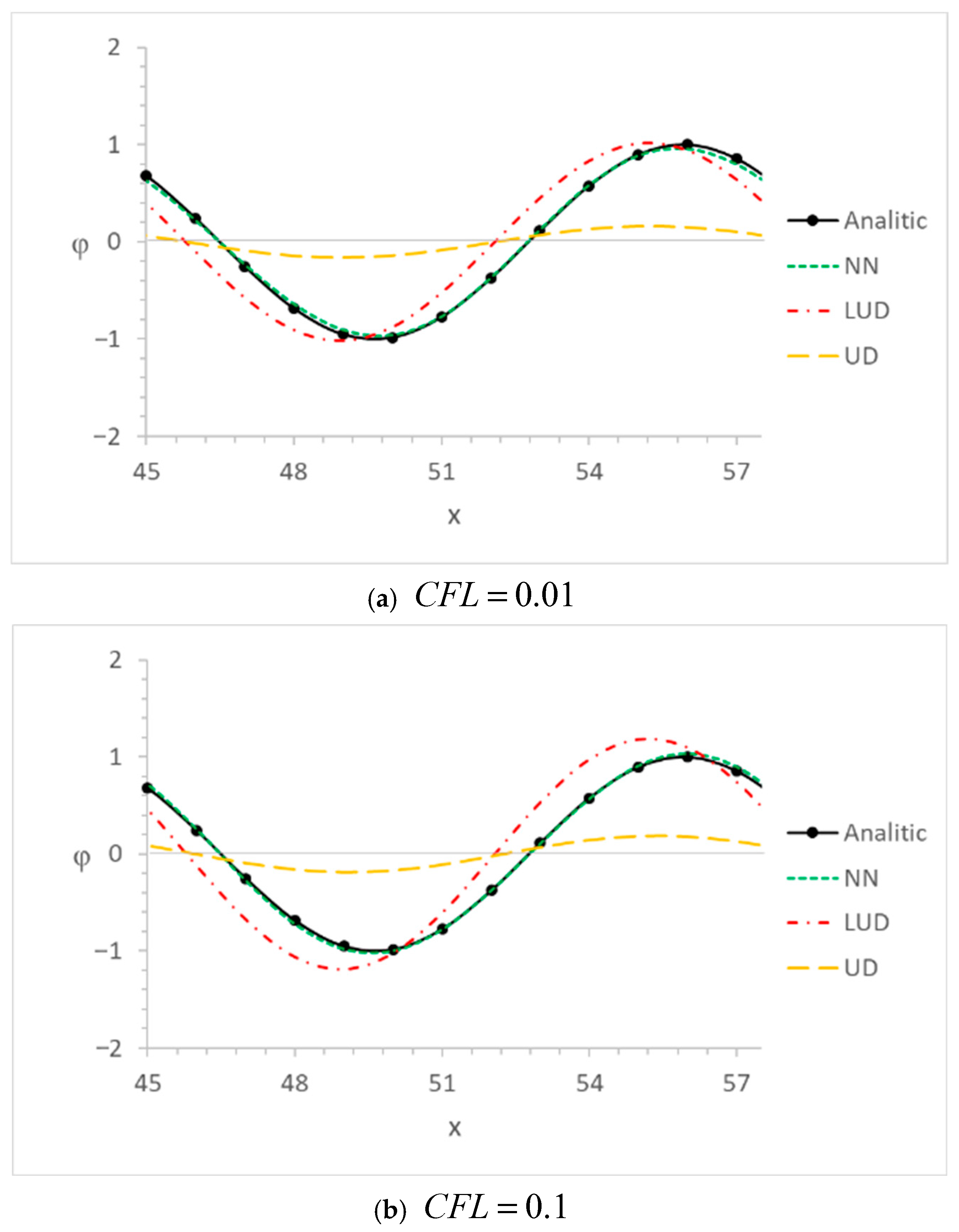 Figure 8. Plots showing φ(x,t) distribution at Δx = 1 m, u0 = 1 m/s, and φ0 = 1. (Analytical solution (Analitic), neural network (NN), as well as LUD and UD schemes).