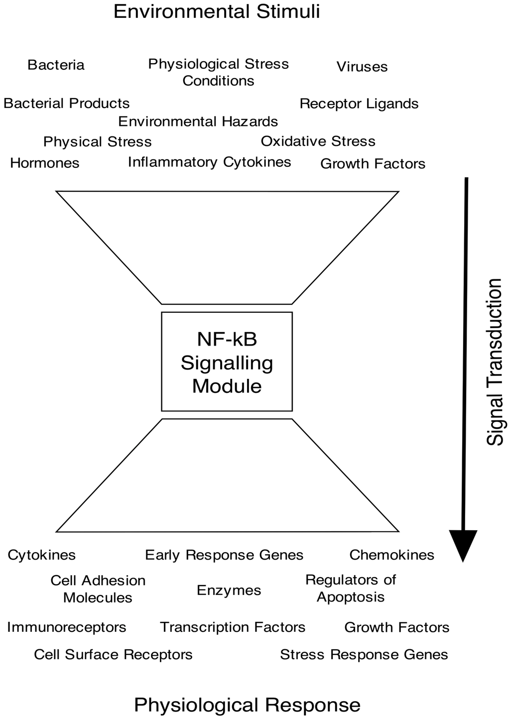 High-level representation of how the multitude of inducers of the NF-κB signalling pathway, which converge on the NF-κB signalling module (NF-κB, IκBα and IKK), before diverging to regulate a multitude of gene products, has the topology of a bow-tie motif from systems biology. Pahl [] advises that there are over 150 known inducers of NF-κB activation, which can be allocated to a number of categories of environmental stimuli. Similarly, Pahl advises that more than 150 genes are known to be regulated by NF-κB, which can again be categorised into a number of key physiological responses.