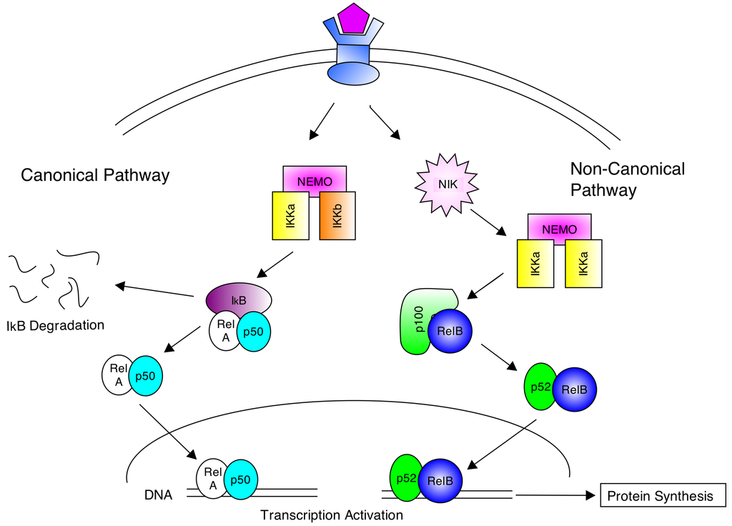 NF-κB activation is controlled by two distinct pathways, which have been termed the canonical and non-canonical pathways [,,] (see Figure 2 for a diagram of the two NF-κB signalling pathways). Activation of the canonical pathway leads to IKK (IκB kinase)-mediated phosphorylation, ubiquitination and degradation of IκB, allowing the transcription factor to translocate to the nucleus and activate genes bearing cognate binding sites. The non-canonical pathway is IκBα-degradation independent and involves activation of NIK and regulation of the p100 NF-κB subunit. Activation of NF-κB results in the induction of gene expression of a number of inflammatory response proteins, including the inhibitor IκBα, thus providing a negative feedback mechanism that controls transient activation of the pathway.
