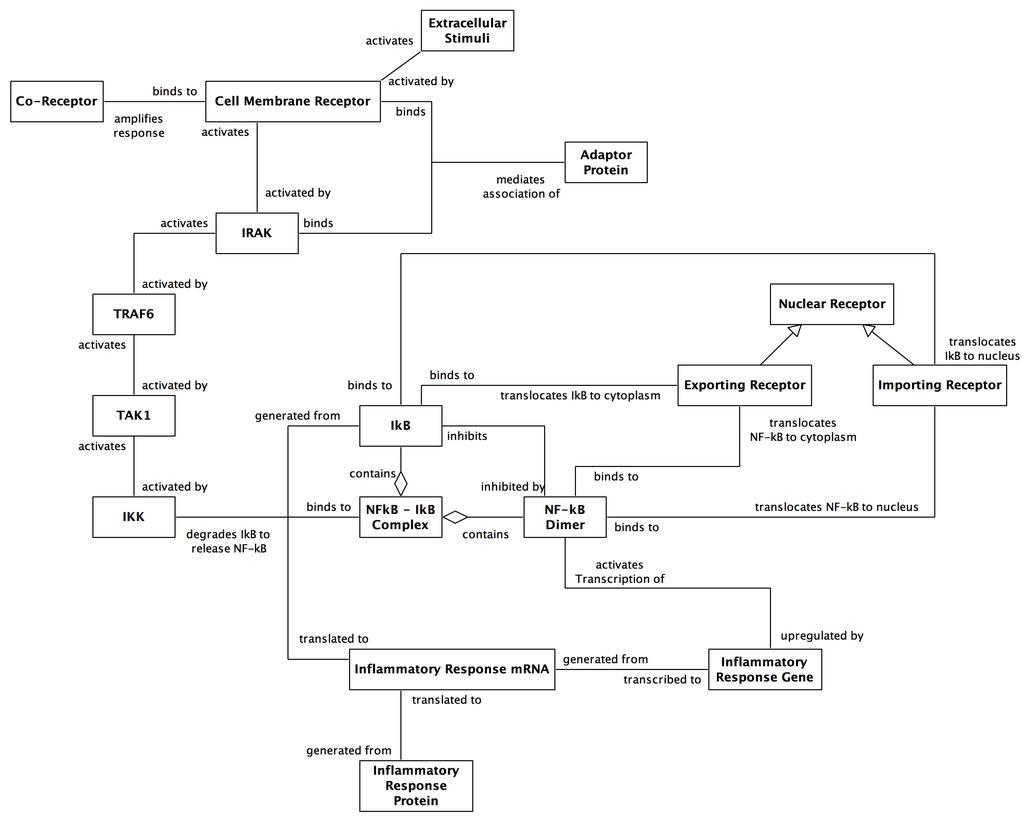 Unified Modelling Language (UML) class association diagram for the canonical NF-κB signalling pathway. The layout used follows the spatial aspects of the cascade of component relationships involved in the biological system from cell membrane activation down to gene transcription within the nucleus. The diagram conveys directed relationships by the labels at each end of the connectors. The arrowheads pointing towards the nuclear receptor convey inheritance, such that exporting receptor and importing receptor are sub-types. The unfilled diamonds on the NF-κB-IκB complex denote aggregation, i.e., an IκB component and an NF-κB component aggregate to form the inhibited complex.
