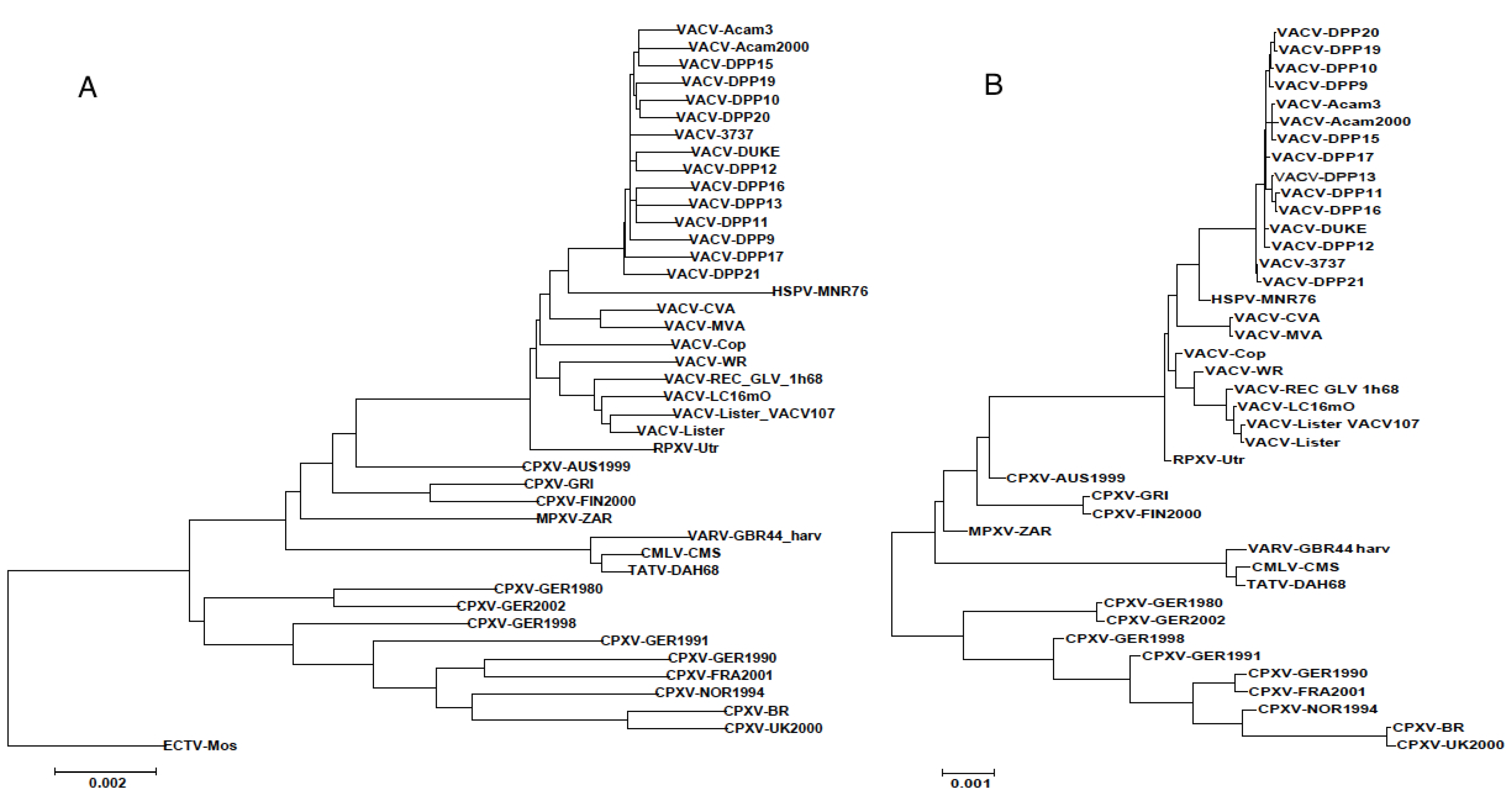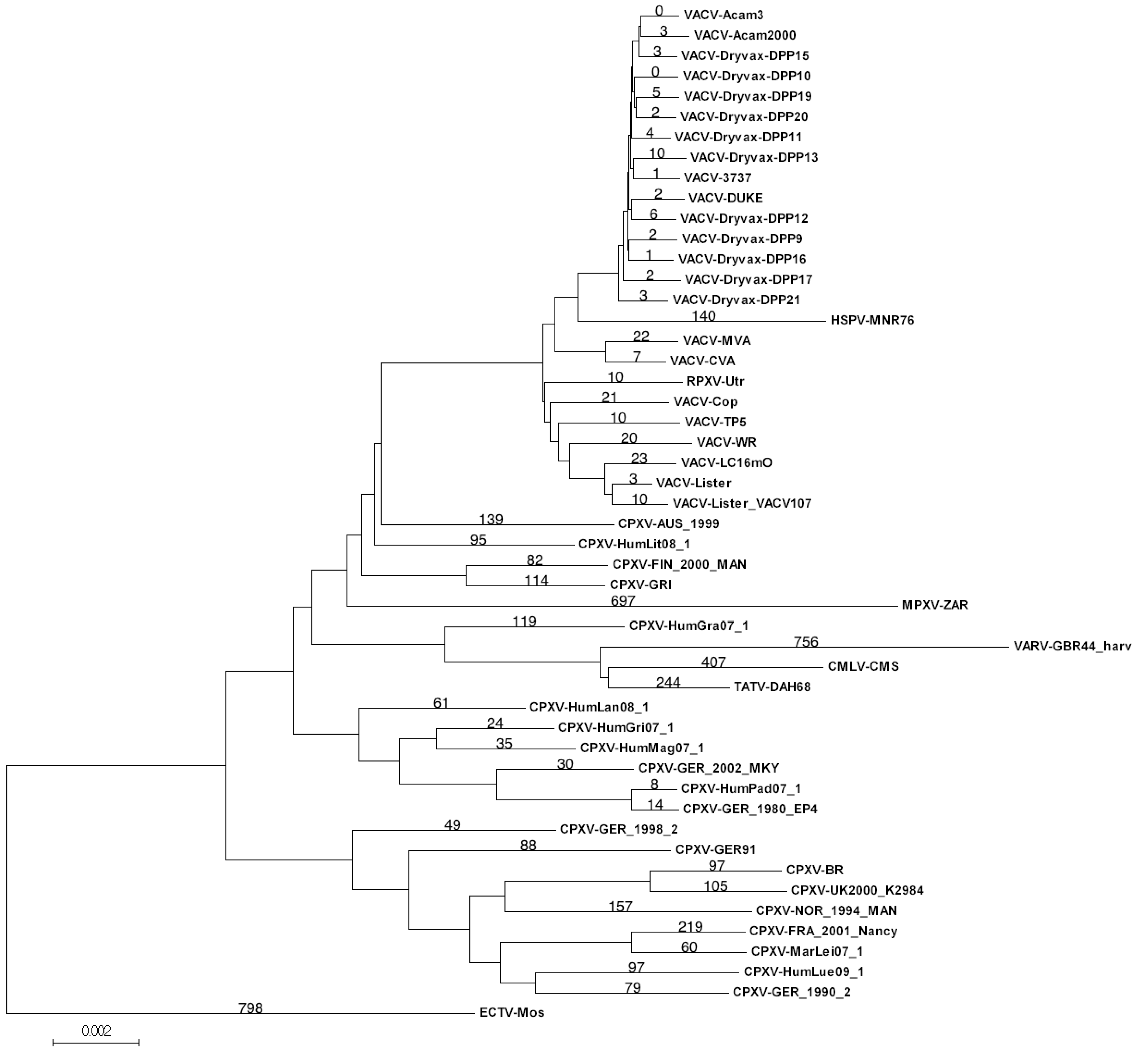The core alignment was constructed using the following genome sequences (listed as strain name, GenBank accession number): VACV-Acam3, AY313848; VACV-Acam2000, AY313847; VACV-Dryvax-DPP15, JN654981; VACV-Dryvax-DPP17, JN654983; VACV-Dryvax-DPP13, JN654980; VACV-Dryvax-DPP11, JN654978; VACV-Dryvax-DPP16, JN654982; VACV-Dryvax-DPP9, JN654976; VACV-Dryvax-DPP10, JN654977; VACV-Dryvax-DPP20, JN654985; VACV-Dryvax-DPP19, JN654984; VACV-DUKE, DQ439815; VACV-Dryvax-DPP12, JN654979; VACV-3737, DQ377945; VACV-Dryvax-DPP21, JN654986; HSPV-MNR76, DQ792504; VACV-CVA, AM501482; VACV-MVA, U94848; VACV-Acam3000, AY603355; VACV-WR, NC_006998; VACV-LC16mO, AY678277; VACV-Lister_VACV107, DQ121394; VACV-Lister, AY678276; VACV-Cop, M35027; VACV-TP5, KC207811; RPXV-Utr, AY484669; CPXV-AUS_1999, HQ407377; CPXV-GRI, X94355; CPXV-FIN_2000_MAN, HQ420893; CPXV-GER_1980_EP4, HQ420895; CPXV-GER_2002_MKY, HQ420898; CPXV-GER91, DQ437593; CPXV-GER_1998_2, HQ420897; CPXV-FRA_2001_Nancy, HQ420894; CPXV-NOR_1994_MAN, HQ420899; CPXV-BR, NC_003663; CPXV-UK2000_K2984, HQ420900; CPXV-HumLue09/1, KC813494; CPXV-MarLei07/1, KC813499; CPXV-HumPad07/1, KC813496; CPXV-HumGri07/1, KC813511; CPXV-HumMag07/1, KC813495; CPXV-HumLan08/1, KC813492; CPXV-HumGra07/1, KC813510; CPXV-HumLit08/1, KC813493; TATV-DAH68, NC_008291; CMLV-CMS, AY009089; VARV-GBR44_harv, DQ441444; VARV-YUG72, DQ441448; MPXV-ZAR, NC_003310; ECTV-Mos, NC_004105.