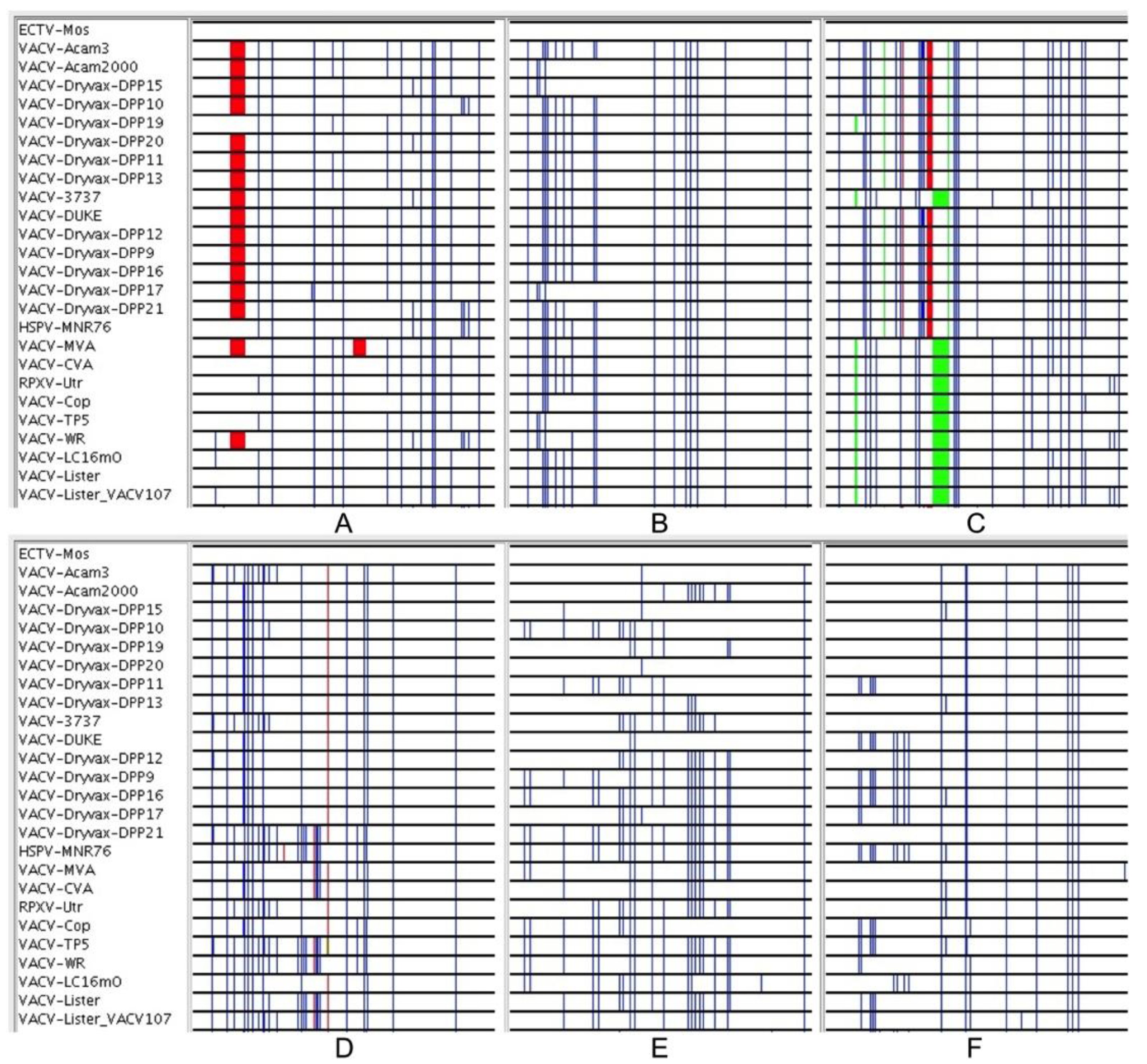 (A–F): 350 nt segments of the core alignment (before gapped columns were removed) viewed with the Base-By-Base Visual Summary view. VACV sequences are all compared to ectromelia virus: Blue lines show SNPs; red and green show deletions and insertions, respectively.