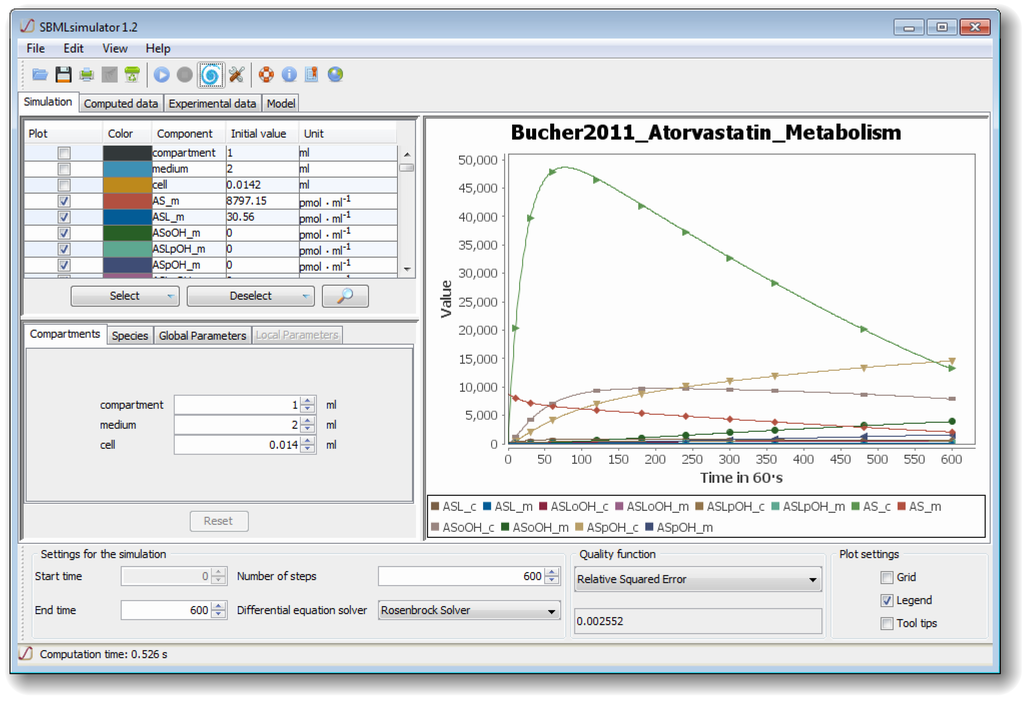 Figure 1) comprises several separated sub-windows for the presentation of simulation results as well as for settings that can be modified by the user: at the lower part of the GUI, SBMLsimulator enables the user to choose the numerical solver and to set the start and end point as well as the step size of the simulation. For some solvers an error tolerance can also be specified under Edit/Preferences. The user also has the choice between different quality functions for calculating the distance between simulated and experimental data. The upper left part of the window allows the user to select, which model quantities should be plotted. Furthermore, the compartment, parameter and initial values of metabolites can be modified in the middle left part. Finally, the simulation of the model with the chosen settings can be conducted by one of the GUI’s control elements.