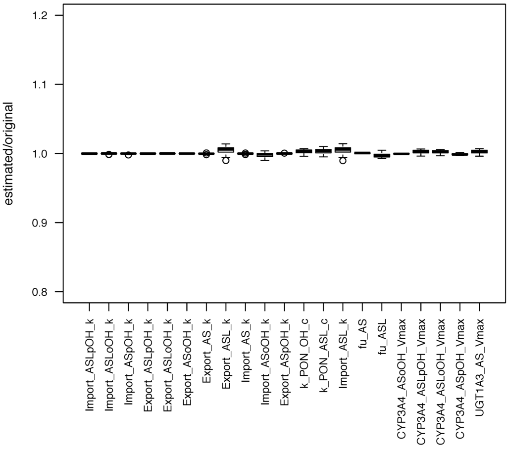 28] were run on a computer cluster. The distribution of the 50 estimations with the best fitness values is shown here. For each parameter the estimated values were divided by the original parameter value prior to plotting. It is obvious from the plot that all parameters were estimated closely around their original values. The figure has been created with R software package [