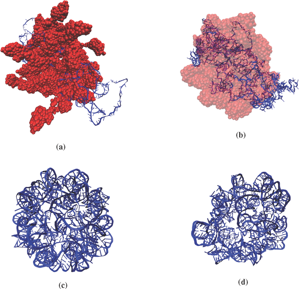 In a series of recent studies, the authors and collaborators have discovered novel multiscale techniques that probe the cross-talk among multiple scales in space and time that are inherent within such systems, yet preserve all-atom detail within the macromolecular assemblies [21–32]. Multiscale perturbation methods can be described in a general framework. First, intermediary subsystem centers of mass that characterize the mesoscale deformation of the system and/or slowly-evolving order parameters (OPs) for tracking the long-scale migration of individual molecules are introduced. Broadly speaking, these OPs filter out the high-frequency atomistic fluctuations from the low-frequency coherent modes and describe coherent, overall structural changes. They have been utilized to capture a variety of effects of multiscale physical systems, including Ostwald ripening in nanocomposites [24], nucleation and front propagation pathways during a virus capsid structural transition [30] and counter-ion and temperature-induced transitions in viral RNA [21,32]. As they evolve on a much longer time scale than that of atomistic processes, the OPs serve as the basis of a multiscale analysis. Multiscale techniques are then used to provide evolution equations for the OPs and/or the subsystem center of mass variables, which are equivalent to a set of stochastic Langevin equations for their coupled dynamics. The resulting perturbative theory is the natural consequence of a long history of multiscale analysis in classical many-particle physics [33–39]. Finally, a computational, force-field-based algorithm suggested by the multiscale development can be implemented. In the current study, we shall validate the theory by comparison with MD within simulations of different structural components in satellite tobacco mosaic virus (STMV).