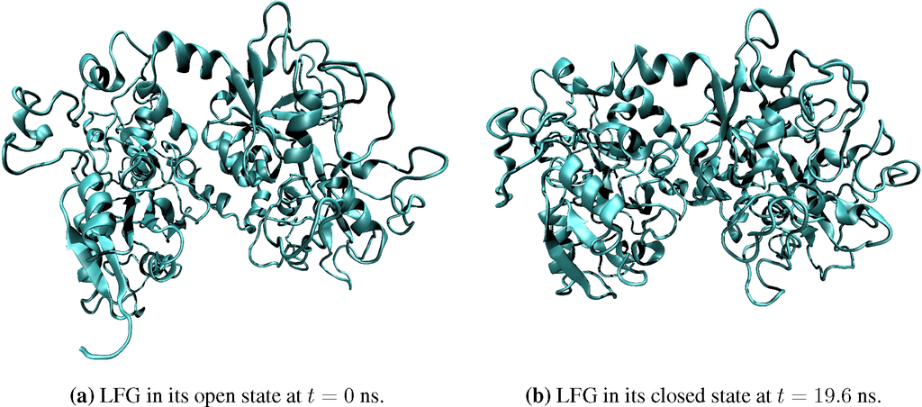 The two-phase coevolution algorithm presented in this section was implemented using NAMD [46] for the SΓ phase within the framework of the DMS software package [20,21,45]. Numerical computations were performed with the aid of LOOS [52], a lightweight object-oriented structure library. All simulations were performed in vacuum under NVT conditions to assess the scalability and accuracy of the algorithm. The first system used for validation and benchmarking is lactoferrin (LFG). This iron-binding protein is composed of a distal and two proximal lobes (shown in Figure 3a). Two free energy minimizing conformations have been demonstrated experimentally: diferric with closed proximal lobes (PDB Code 1LFG) and apo with open lobes [53] (PDB Code 1LFH). Here, the simulation begins with an open lactoferrin structure and details its closing in a vacuum (see Figure 3). The root mean square deviation (RMSD) for lactoferrin is plotted as a function of time in Figure 5a. This quantity demonstrates that the protein reaches equilibrium in about 5 ns. The transition leads to a decrease in the radius of gyration of the protein by approximately 0.2 nm, as shown in Figure 5b.