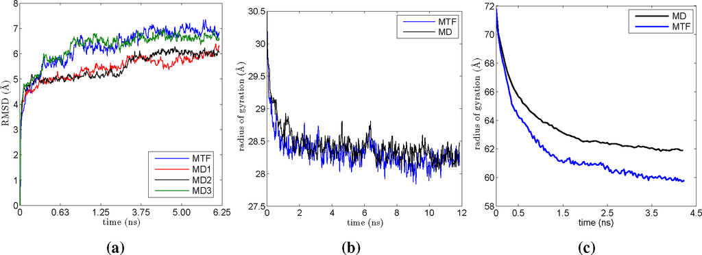 MD and multiscale factorization (MTF) results for lactoferrin and Nωv simulations. (a) RMSD variation of lactoferrin as a function of time for a series of three MD and one MTF runs; (b) the radius of gyration decreases in time as lactoferrin shrinks; (c) temporal evolution of the radius of gyration of Nωv computed using MD and MTF.