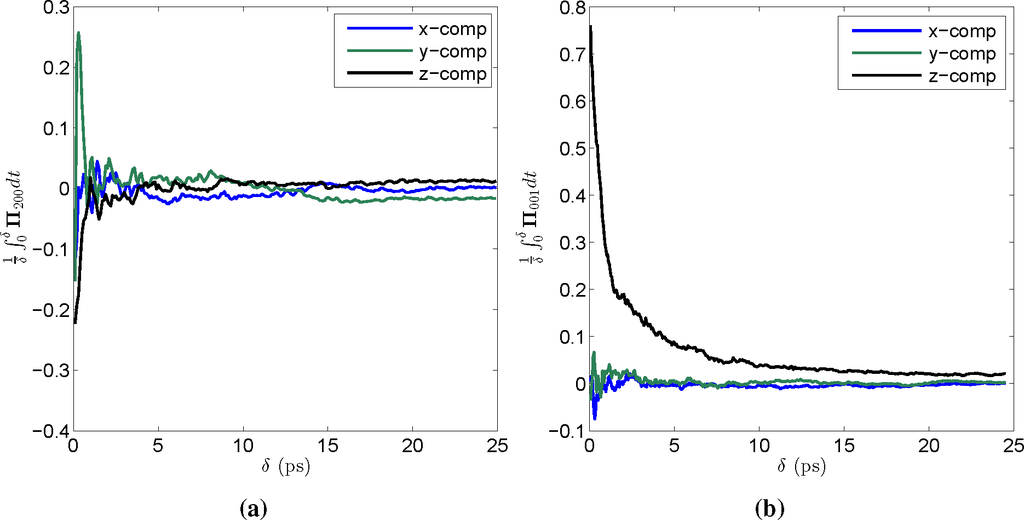 as a function of δ for coarse-grained (CG) variables selected from among those used in simulating the contraction of Nωv. Initially, the integral experiences large fluctuations, since for δ small, only relatively few configurations are included in the time average constituting the integral, but as δ increases, the statistics improve and the integral becomes increasingly flat. (a) A plot of the time integral of Π for a high order CG Φ200; (b) a plot of the time integral of Π for a low order CG Φ001.