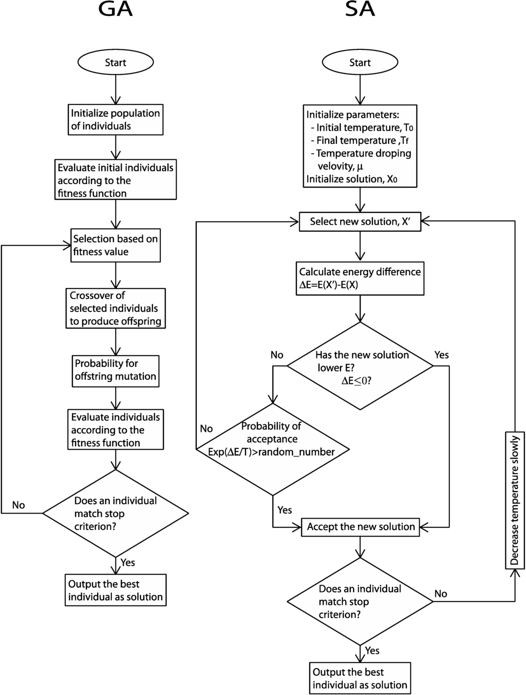 Workflow schemes for general genetic algorithms (GA) and simulated annealing (SA) implementation.