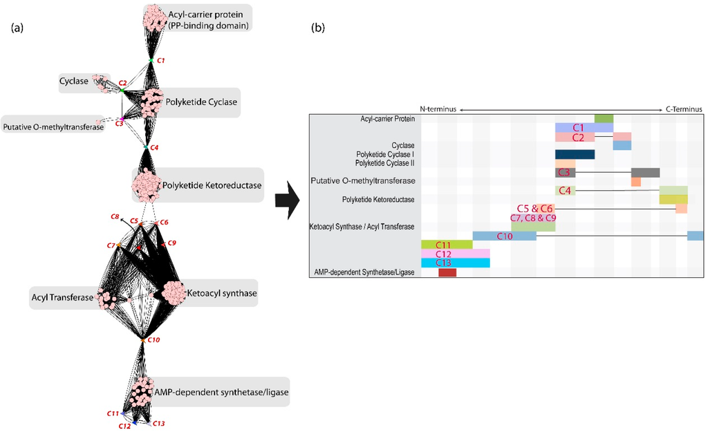 (a) Giant Connected Component (GCC) uniting 423 proteins. Composite proteins are indicated using the labels C1–C13. Communities within the GCC are labelled with their consensus function. Occasionally, members of a community are present in two different isoforms (e.g., “Polyketide Cyclases” are long form and short form); (b) A “lego diagram” of the block structure of the proteins and how gene remodelling provides a path connecting all the proteins in this GCC. Homologous protein parts are aligned in the same column. The rows are the different kinds of genes. Occasionally, in order to facilitate lining the blocks up, it was necessary to split the proteins. In those cases, black lines join contiguous protein parts.