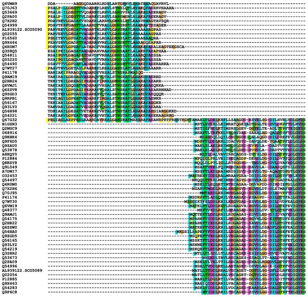 Protein sequences used for this case are derived from Kim and Yi [] and the Streptomyces coelicolor genome. Kim and Yi [] analysed 319 Actinobacterial genomes to predict 280 known type II PKS proteins. The full list of all Actinobacterial genomes and the 280 predicted type II PKSs is available in supplementary file S1.xlsx. A BLAST search was carried out on the 280 type II PKS proteins against the S. coelicolor (A3)2 genome (EMBL/GenBank databases accession number AL 645882) resulting in 143 significant hits from this genome (listed in S2.txt). The S. coelicolor genome was used, as it is an important species of Actinobacterium, which are soil dwelling organisms that are prolific producers of polyketides.
