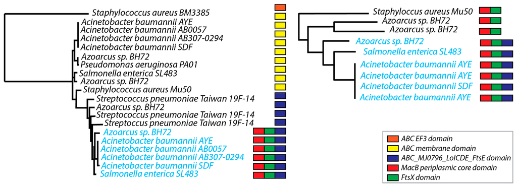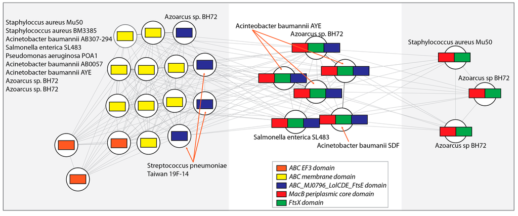 The 16 genes on the left are members of the ABC_ATPase Superfamily as defined by the Batch CD search tool []. However, only four (gene set A) contain the specific domain hit ABC_MJ0796_LolCDE_FtsE found in the composites. Batch CD identified FtsX and Mac_PCD specific hits in the three component genes on the right (gene set B) and also in the six composite genes. Consequently the composite genes are an amalgamation of these three domains: FtsX, Mac_PCD and ABC_MJ0796_LolCDE_FtsE.
